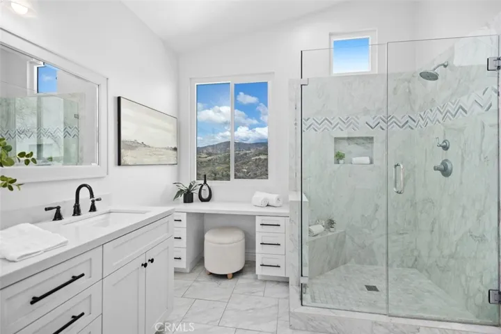 Upstairs, there is a loft/tech space with built-in cabinetry. Secondary bedrooms feature ceiling fans and mirrored closets. A hall bathroom includes dual sinks and a separate shower/tub area. The primary suite offers large windows with mountain views and a walk-in closet with built-in shelving. The primary bathroom includes dual sinks, a soaking tub, and a separate shower. The backyard features a custom pebble-tech pool and spa with cascading waterfalls, a gas fire pit with seating, a grass area, and wide open mountain views. This home combines an updated interior with resort-style outdoor living, all in a private cul-de-sac location.