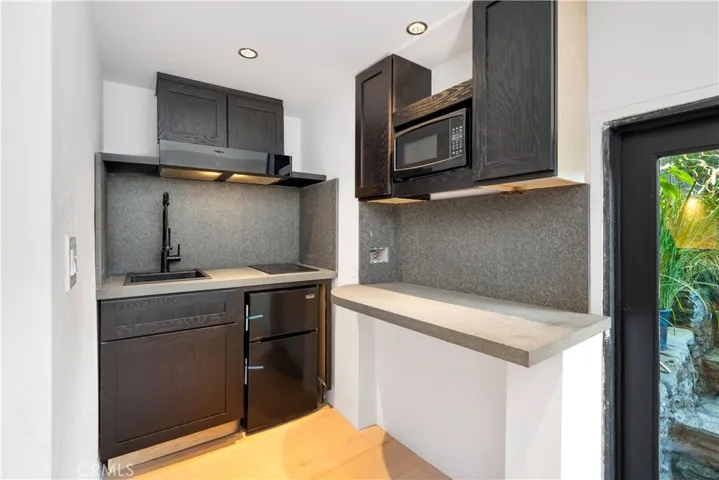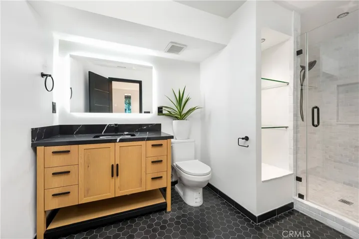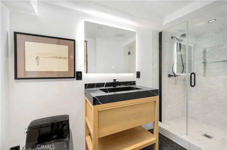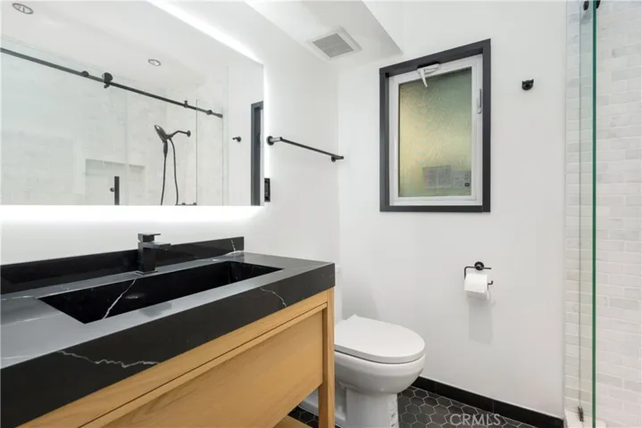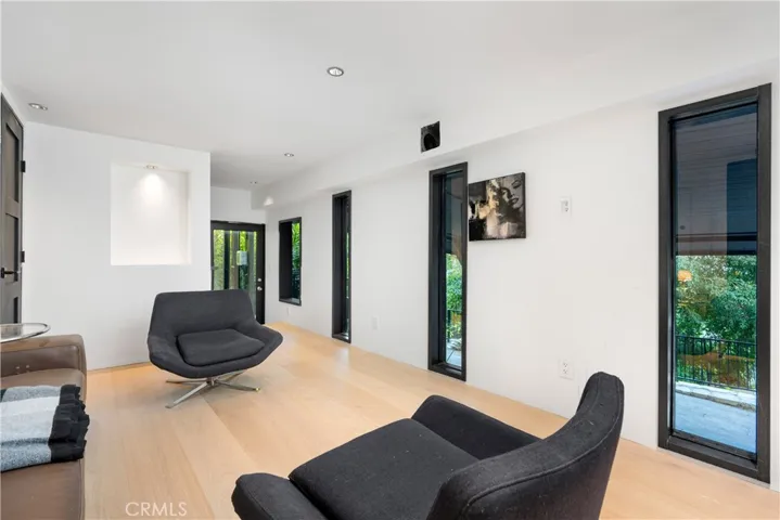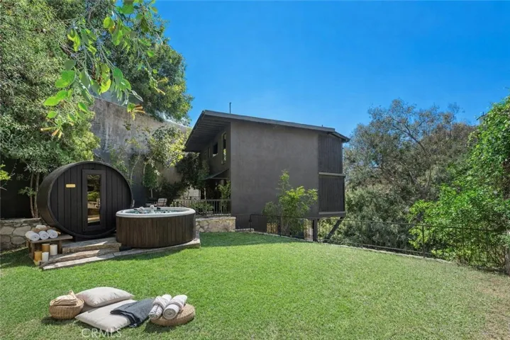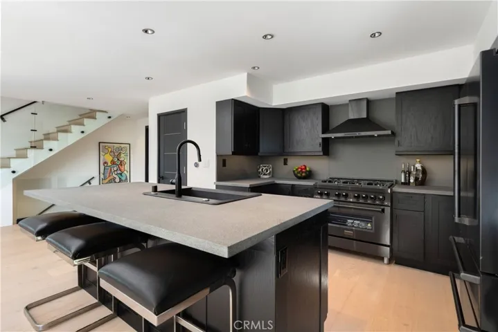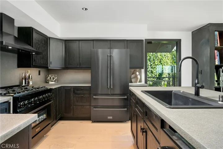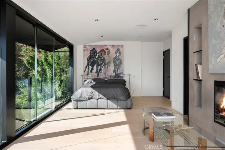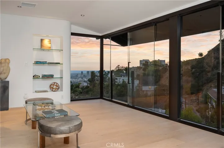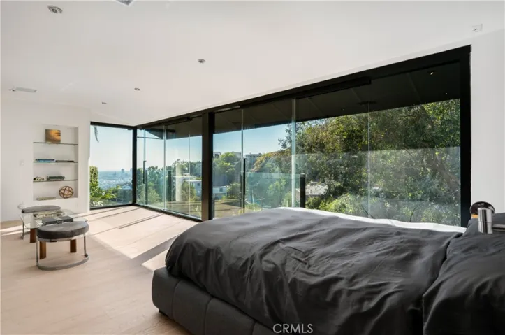 Originally offered for $3,950,000. This totally new sleek and sexy architectural is now priced below market. Gated private estate with parking for up to 6 cars, surrounded by mature trees, a big grass yard and patio. Sweeping VIEWS from the city to the sea and beyond. Step through the glass entry to an open floor plan great room- living room, kitchen, powder room; meticulous design throughout with city views through walls of glass with clear glass sliders creating an open balcony effect. Smooth Venetian plaster walls encase a warm fireplace. Wide plank light oak floors and custom doors complete the sophisticated, albeit minimalist, look. The primary bedroom suite features two bathrooms and a very large dressing room. There is also a fireplace, bookshelves, and a 36 ft wall of glass with City Views. The guest suite has its own private terrace, en suite bathroom and a third fireplace. There is another bedroom suite (ADU) with its own private entrance, en suite bathroom and kitchenette. This is a distinctively special “to the studs” build out, now underpriced and in a new market full of older homes that need total renovation.