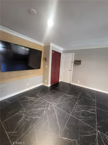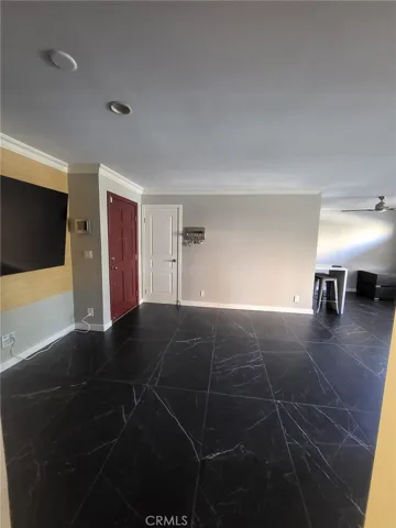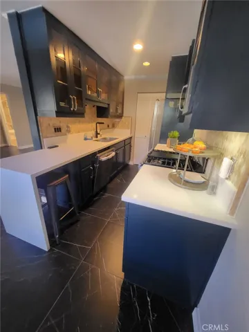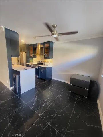 Modern, move-in ready 1BD/1BA with balcony in gated Brentwood Villas. Sunlit, north-facing, single-level home features an open living/dining area finished in oversized marble-look porcelain tile, crown molding, recessed/track lighting, and a ceiling fan. Designer kitchen with white quartz counters and a waterfall peninsula for stool seating; full-height travertine backsplash; custom dark cabinetry with glass uppers; matte-black faucet; double-bowl sink; pantry/utility niche; and a stainless appliance suite including a 5-burner gas range with chimney hood and dishwasher. The spacious bedroom offers bamboo flooring, a ceiling fan, and a walk-in closet with built-ins. Updated bath showcases a floating vanity with LED mirror, stone mosaic tile, and a tub/shower with glass enclosure. In-unit stacked laundry behind louvered doors. Private balcony overlooks a tree-lined street—perfect for morning coffee. Community amenities include a pool, dry sauna, renovated fitness center (2020), secure lobby with elevator, and gated entry; HOA includes earthquake insurance. One assigned gated parking space.