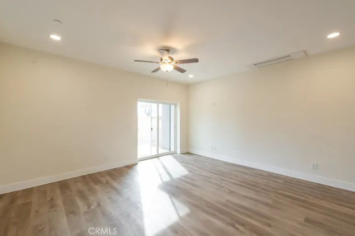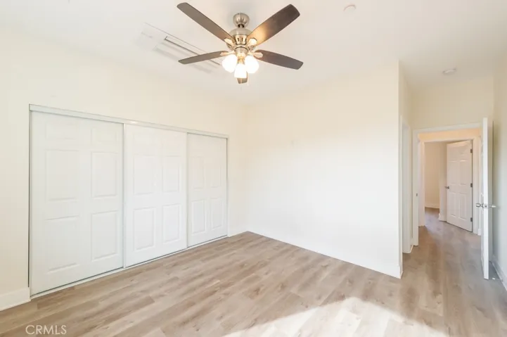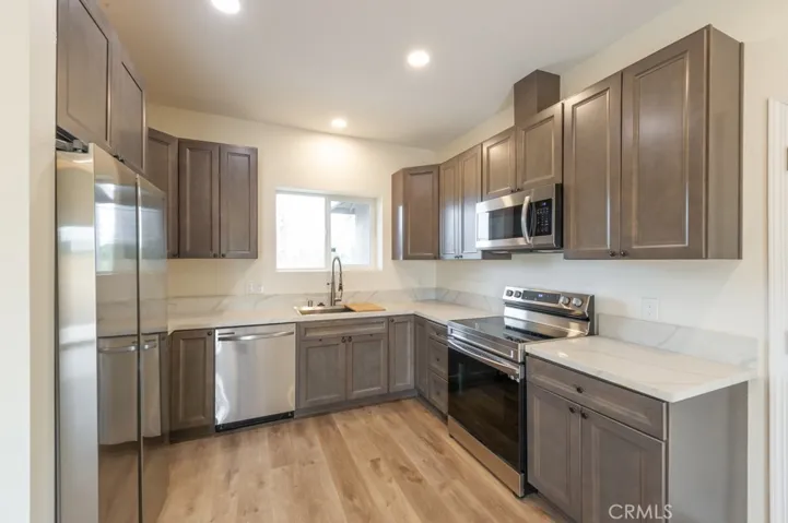 Step inside to an open floor plan featuring soaring 9-foot vaulted ceilings and durable laminate plank flooring throughout the main living areas. The modern kitchen shines with hardwood cabinets featuring soft-close doors and drawers, quartz countertops, and sleek stainless steel appliances — perfect for cooking and entertaining.