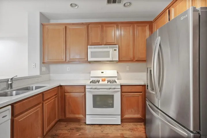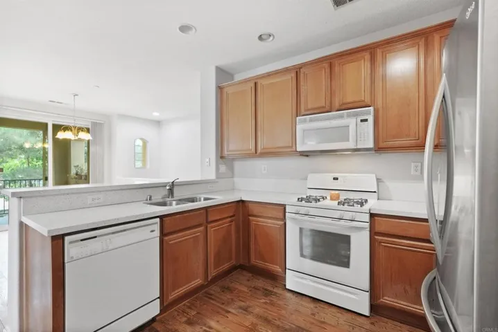 This charming two-bedroom, two-bathroom condo features an additional office area with a built-in desk, perfect for today’s lifestyle needs. The open-concept kitchen flows seamlessly into the dining & living area, complete with a cozy fireplace. The kitchen and bathrooms feature quartz countertops, while laminate wood flooring adds warmth and style. Enjoy the convenience of an in-unit laundry closet and a two-car garage with direct entry. This home combines comfort, convenience, and community.