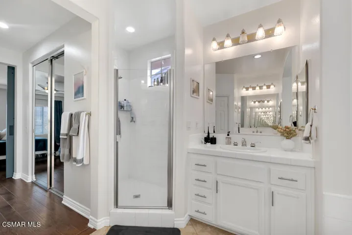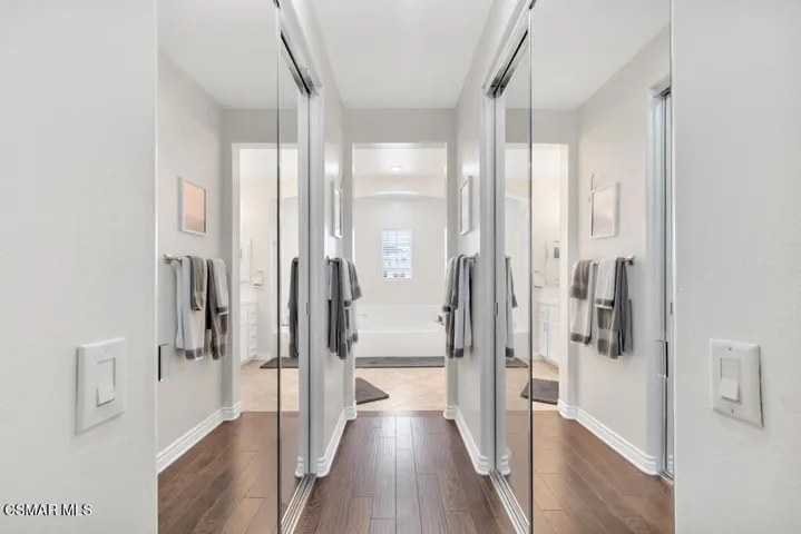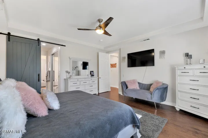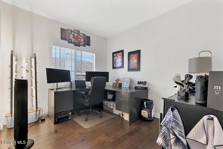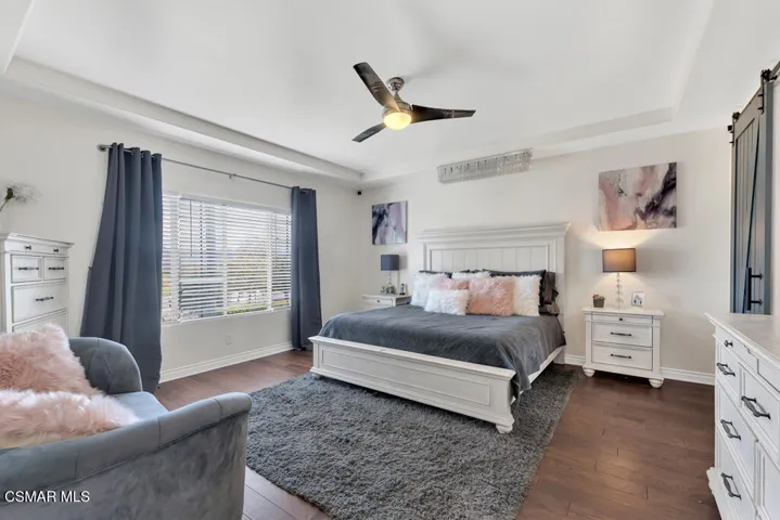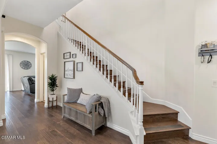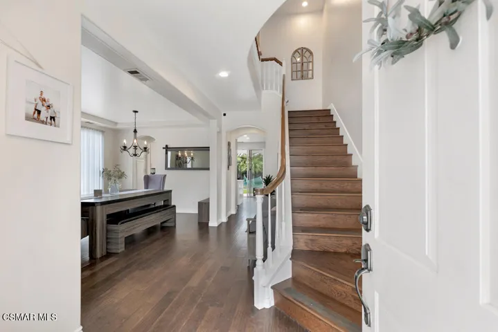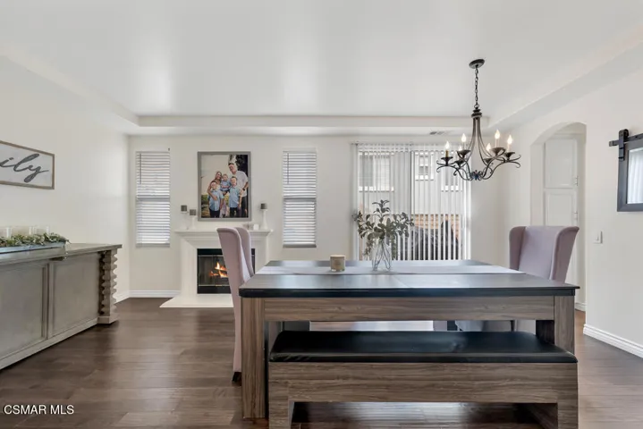 Welcome to this beautifully updated home offering 4 bedrooms, 2.5 baths, and a spacious bonus room perfect for everyday living. A soaring cathedral ceiling at the entry and gorgeous wood flooring throughout create a warm, inviting atmosphere. Thoughtful details such as designer paint, ceiling fans, and custom touches combine style with comfort. The formal dining room, highlighted by a chandelier and sliding doors to the side yard, flows seamlessly into the living room with a cozy fireplace. The gourmet kitchen showcases an extended center island, elegant quartz counters, sleek white cabinetry, and a farmhouse sink – opening to the family room complete with a second fireplace, making it the ideal gathering spot. Upstairs, the primary suite offers a true retreat with dual closets featuring custom built-ins and a spa-inspired bathroom with dual vanities, soaking tub, and separate shower. Three additional bedrooms, a generous bonus room, and convenient upstairs laundry complete the second level. Enjoy the private backyard with picturesque mountain views, a covered patio, lush landscaping, and a spacious grassy area – perfect for entertaining or relaxing. A 3-car garage with built-in cabinets provides ample storage. Located in a prime neighborhood, close proximity to Sycamore Canyon K-8 School, parks and The Village. Exceptional!