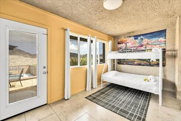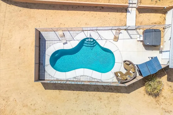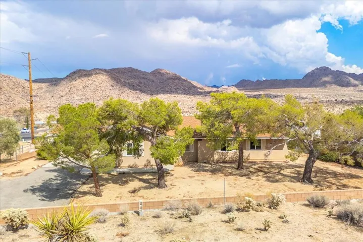 Seller financing will be considered Welcome to A Million Stars Manor, a fully furnished desert retreat with four years of proven short-term rental success. Perfectly positioned on the main road to Joshua Tree National Park, which draws more than three million visitors annually, this 1,532 sq ft, 3-bedroom, 2-bath home sits on a desirable corner lot that combines privacy with high visibility. Inside, the thoughtful layout features a cozy sunken living room with a Saltillo-tiled fireplace, a bright sunroom for sunrise views, and an open kitchen and dining area with mountain and backyard vistas. The primary suite includes dual vanities and a walk-in shower, while the secondary bath offers an extended vanity and tub/shower combo. Tile and laminate flooring flow throughout the home, creating an easy-care, inviting space. Step outside to your private desert oasis: a sparkling in-ground saltwater pool, above-ground hot tub perfect for stargazing, multiple lounge areas, and mature desert landscaping. A detached, finished 2-car garage provides flexible use and ample parking. Additional highlights include 16 owned solar panels for low operating costs, strong branding with excellent rental performance, and an unbeatable location just minutes from the park entrance, restaurants, shops, and galleries. Offering both lifestyle and income potential, A Million Stars Manor is a rare Joshua Tree opportunity, a peaceful desert haven that also delivers proven profitability.
