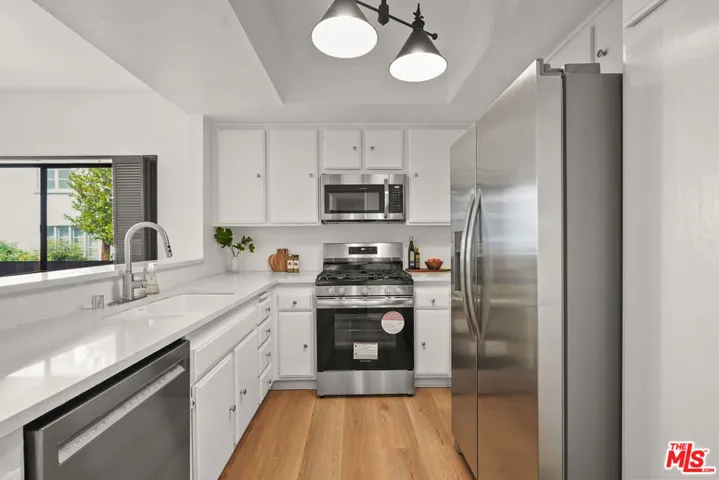 Presenting a newly updated townhouse style unit that exudes a warm and inviting atmosphere. This two-story end unit is designed in a townhouse style, offering an open floor plan with soaring ceilings in the main living areas. The living room is adorned with newly installed floors and features a cozy fireplace, perfect for relaxing evenings. This unit is filled with natural light, thanks to the sliding glass doors that lead to a delightful private patio area. Whether you prefer to surround yourself with lush plants and greenery or create a small entertainment space, the patio provides a versatile outdoor retreat. The kitchen showcases multiple new appliances and fixtures in addition to a convenient breakfast bar, and pantry closet. The first level is further enhanced by a guest powder room, featuring a new carera marble countertop and new light fixtures, reflecting the attention to detail throughout the property. Ascending to the upper level, you’ll find two spacious bedrooms, each offering ensuite bathrooms. The primary suite includes an oversized walk-in closet, providing an abundance of closet space. Both bedrooms are bathed in natural light, creating a serene and comfortable ambiance. Ideally situated in a highly sought after Westside neighborhood, this townhouse is only minutes away from an array of dining options, entertainment venues, and shopping destinations. It offers convenient access to Century City, Westwood Village, UCLA, beaches and the 405 and 10 freeways. Don’t miss this incredibly rare opportunity. HOA monthly fee includes Earthquake Insurance!