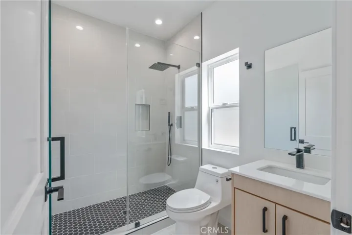 Inside, you’ll find an open floor plan with wide-plank flooring, recessed lighting, and a spacious living area. The sleek kitchen features quartz countertops, soft-close cabinetry, and stainless steel appliances — all powered by electricity for eco-friendly living. The primary suite includes a custom-organized closet and private bath with a glass-enclosed shower and designer fixtures. The second bedroom and bath are perfect for family, guests, or a home office.
