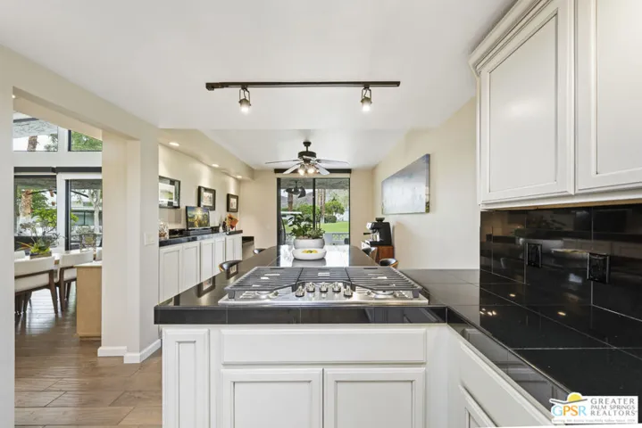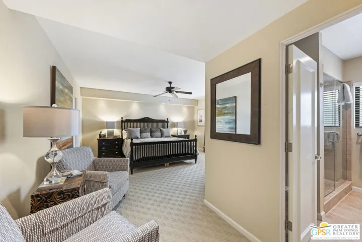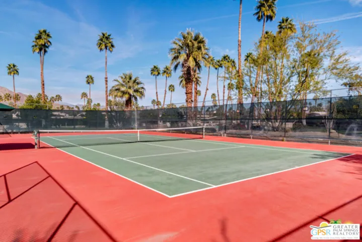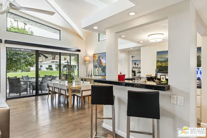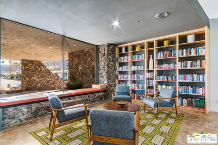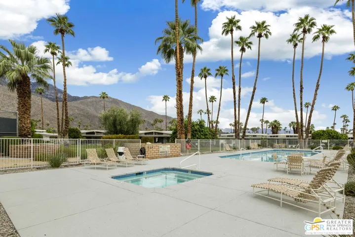 Experience Mid-Century Modern Living in Canyon Estates! Discover the hallmark of mid-century modern architecture in the sought-after Canyon Estates community, where acclaimed architect Charles E. Du Bois designed homes that blend timeless style, comfort, and sophistication – perfectly capturing the quintessential Palm Springs iconic lifestyle. Step through an elegant reeded glass double-door entry into a welcoming foyer that opens to a stunning living room, complete with a signature umbrella open beam style ceiling. Walls of glass and iconic clerestory windows frame dramatic east-facing mountain views and invite abundant natural light. The space flows seamlessly to a broad, covered patio overlooking a serene greenbelt with the mountains beyond – ideal for indoor-outdoor entertaining. A floor to ceiling stone-clad fireplace with white marble hearth and “Rat Pack” ready wet bar add to the authentic Palm Springs vibe. This thoughtfully upgraded, move-in-ready home is furnished in a warm neutral palette and features: 2 great ensuite primary bedrooms plus 2 additional bedrooms (currently used as a den and office), 3 well- appointed bathrooms, custom wood built-ins in the den, add functionality and elegance. Modern upgrades include all new Milgard windows, doors, and clerestory windows. A bonus eat-in breakfast area is perfect for morning coffee and extended views. This and much more in easy single level luxury living. Residents enjoy an array of amenities, including 15 pools, 12 spas, tennis and pickleball courts, a PAR-3 golf course, and a clubhouse with a newly upgraded fitness center. These offerings foster an active and social lifestyle in a resort-like environment. With its low-density layout, Canyon Estates provides generous open spaces, a peaceful setting, and a true sense of community.