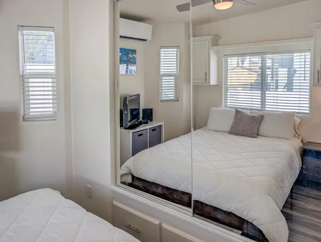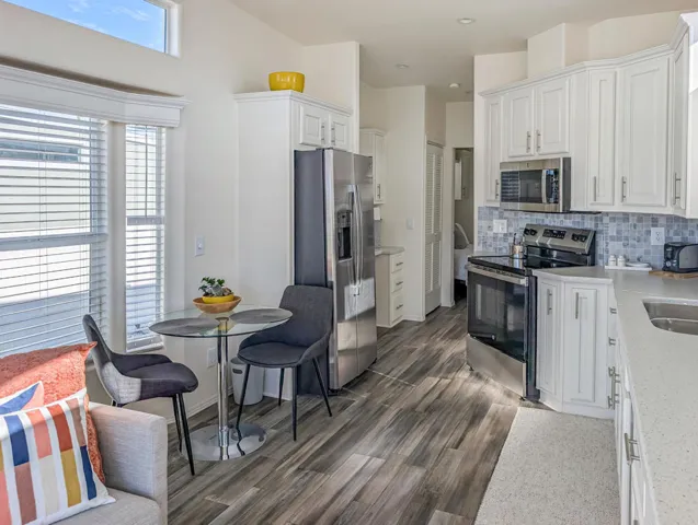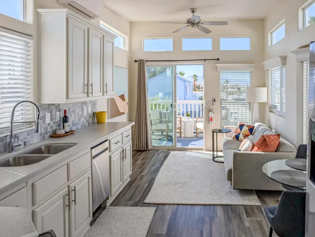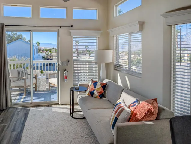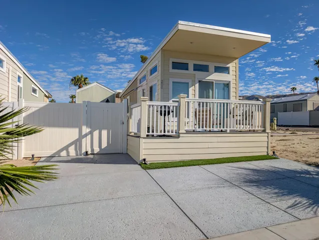 Stunning Turnkey Home at Caliente Springs Resort. This brand new, never-lived-in wedge home offers a truly turnkey experience that stands out as one of the most stunning residences in the park. Built in 2023, this home features one spacious bedroom and one modern bathroom. The residence is equipped with a washer and dryer hook-up, as well as unused, energy-efficient appliances, including a dishwasher. Hardwood floors extend throughout the home, complementing the Corian-style countertops and upgraded marble backsplashes. For enhanced comfort and energy savings, the home includes two ductless mini split systems. Natural light pours in through ample windows, while volume ceilings create a dynamic, open atmosphere. Enjoy the great front deck, which offers spectacular, unobstructed views of Mount San Jacinto and the surrounding regional hills. The private, peaceful backyard is fenced and ready for you to design your own desert retreat–perfect for entertaining guests or enjoying quiet serenity. Located close to the Clubhouse and centrally positioned to access all the amenities and activities at Caliente Springs, this pristine 55+ resort community ensures that you’ll never want to leave. Whether you are seeking a perfect getaway home or a full-time residence, this property offers it all. Community amenities include a nine-hole golf course for year-round play, a healing mineral-fed hot spring pool and spas, and a variety of community-sponsored events throughout the season, all contributing to the pleasure of living in this exceptional place. Please note that the lot is not owned; space rent is $671 per month (subject to change). Easy lender financing is available on approved credit (OAC).