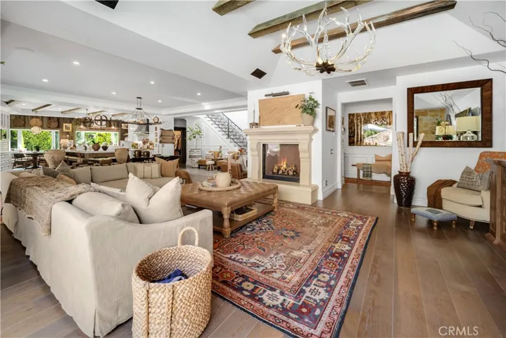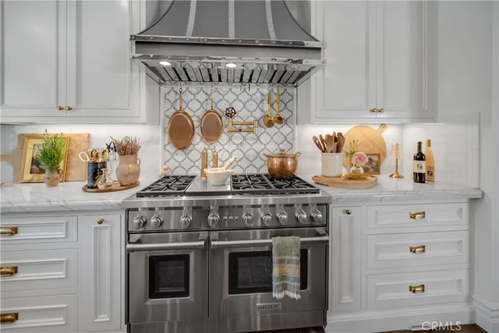 This Beautiful Country Vineyard Estate in the Heart of Hidden Hills has been lovingly remodeled by its designer/owner, Catherine Sorensen, with exquisite craftsmanship and timeless style. This extraordinary home nestled on a private road offers the utmost in luxury, privacy, and sophistication with no detail overlooked you feel like you are in a 5 star boutique hotel. Enter through a dramatic glass-and-steel pivot door into a home where every detail has been thoughtfully curated. The heart of the home is the stunning open-concept kitchen, featuring a large quartzite island, custom walnut cabinetry, built-in banquette area, Waterworks fixtures, Wolf range, Miele coffee station, and steel beam construction accents, a stunning custom hood and a 36″ each Sub-Zero side by side Fridge and Freezer. Bi-fold doors open wide to the backyard, creating seamless indoor-outdoor flow—perfect for entertaining family and friends. The serene primary suite is a sanctuary, boasting reclaimed wood ceilings, a copper soaking tub, heated floors, steam shower, sauna, and Newport Brass and Walker Zanger finishes.