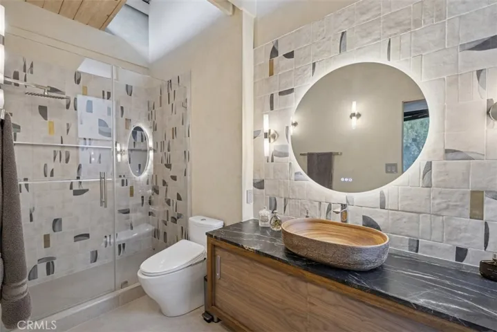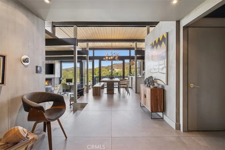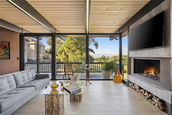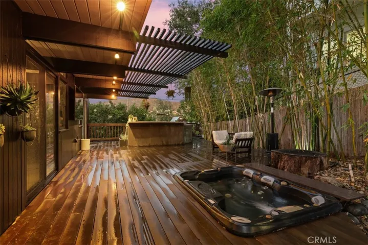 The living space is centered around a dramatic gas fireplace and seamlessly connects to both front and rear outdoor areas. A Teak wood entertainer’s deck spans the back of the home, featuring a Viking outdoor kitchen, built-in spa, and tranquil custom waterfall, all framed by a towering wall of timber bamboo for added privacy.
