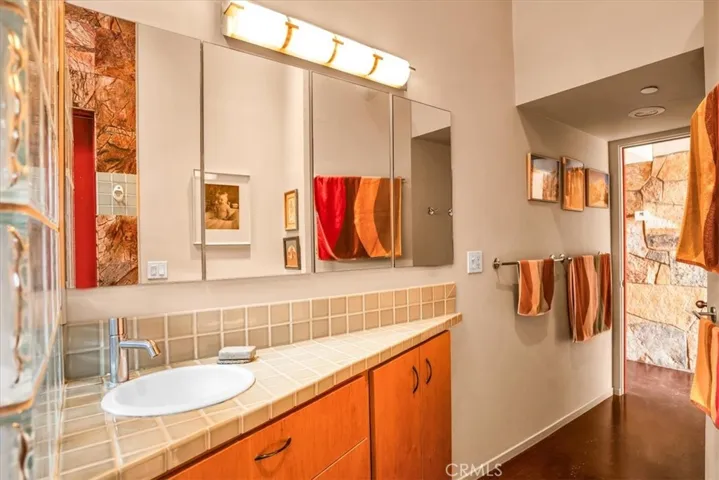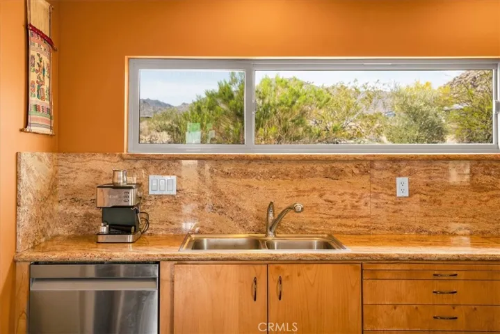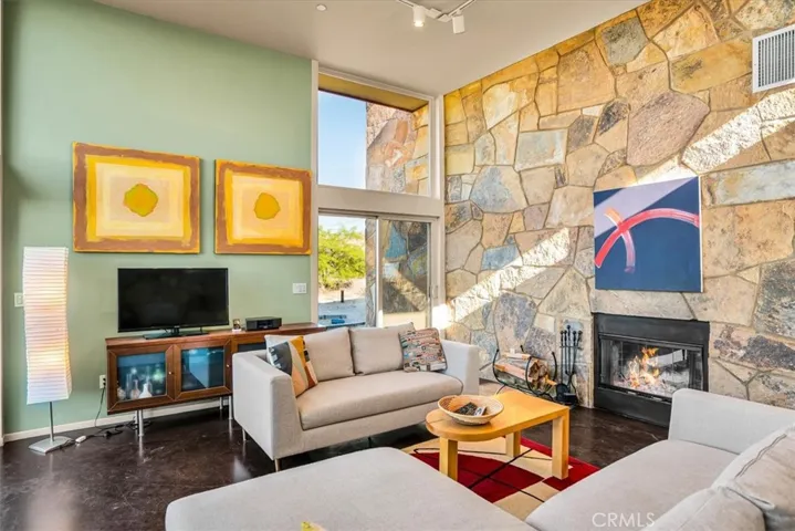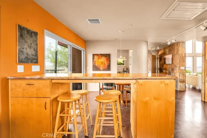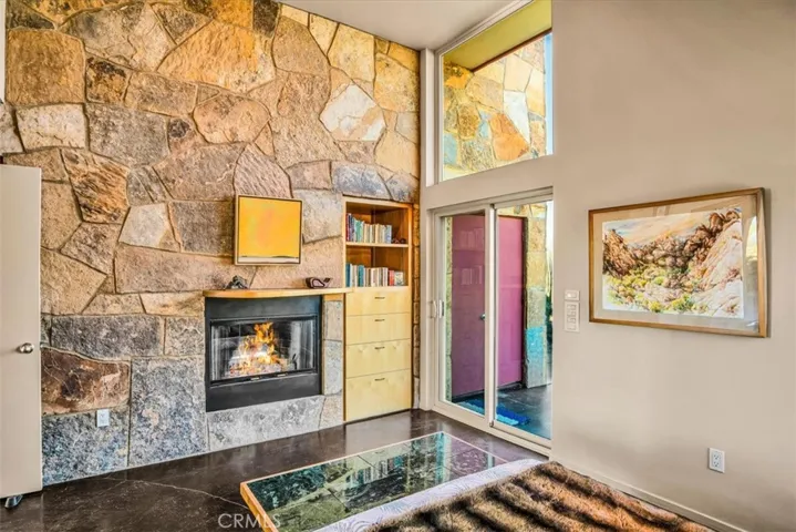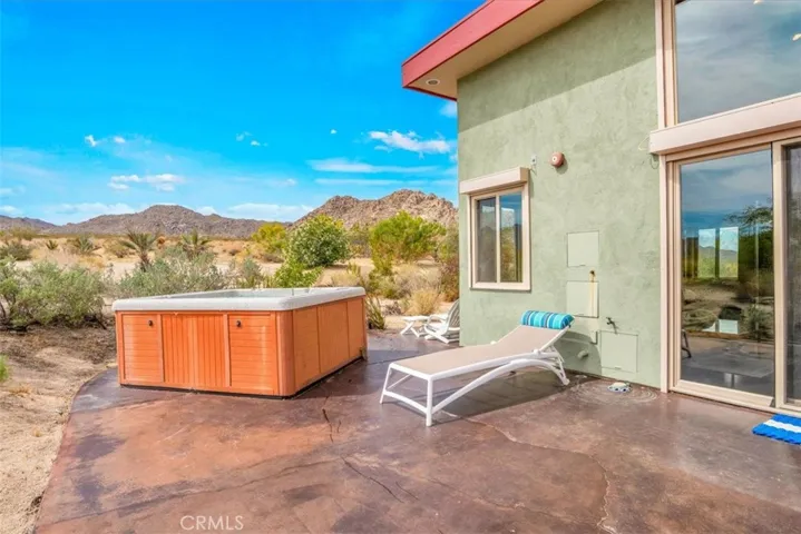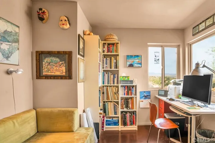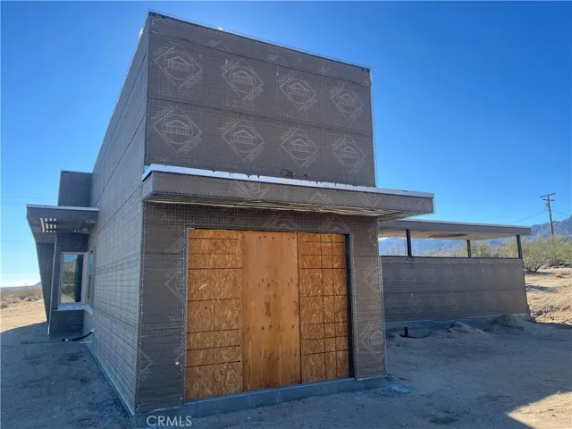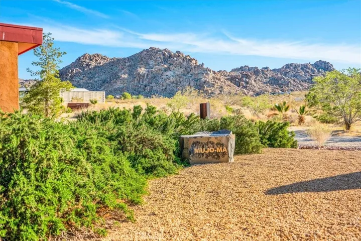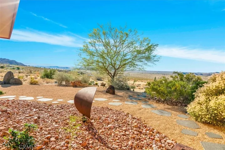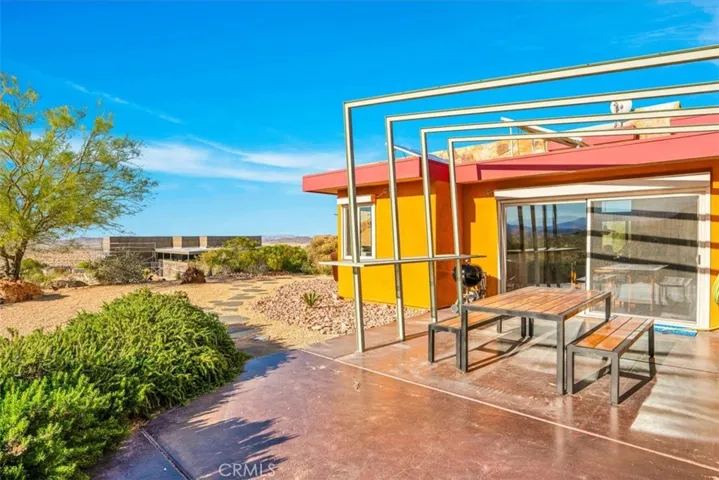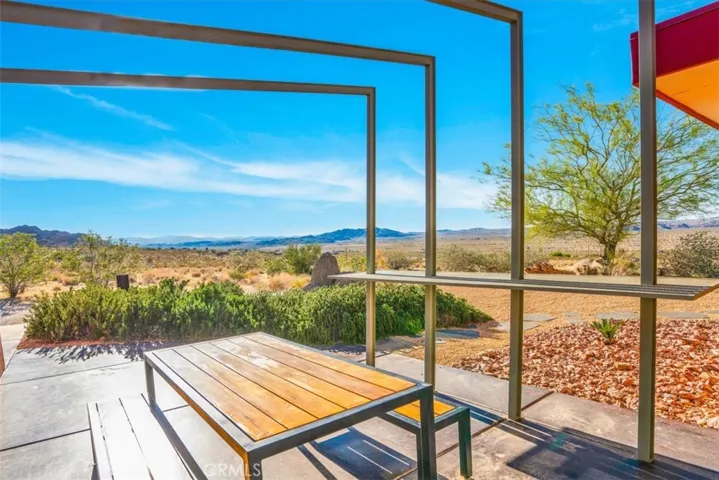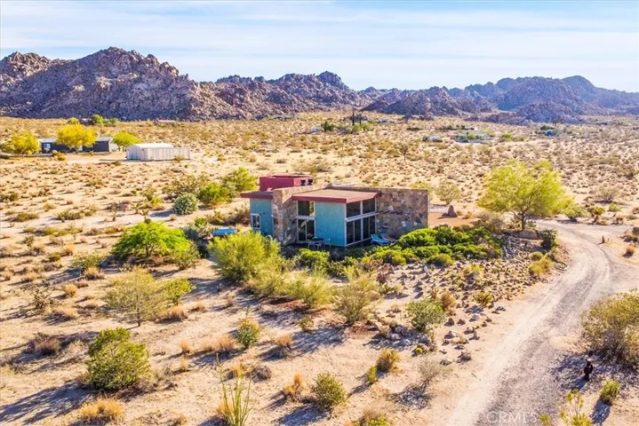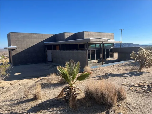 Villa Bajada—A Timeless Architectural Retreat in South Joshua Tree. Perched high near the Joshua Tree National Park boundary, on two contiguous parcels totaling 4.23 acres. Live with nature in this superb mid-century style modern gem while creating your personal studio for art, music, meditation, and entertainment. The main house is a 2007 built 1181 square foot 2-bedroom, 1 bath home with kitchen, dining room, living room, garage and features paid solar panels to reduce utility costs. Nearby the home, an unfinished 1108 square foot building flex space / art or yoga studio, featuring central HVAC, bathroom, another room and garage, plus in-ground pool—an opportunity to complete to taste with the original contractor still available and permit active. Surrounding the home, multiple patios and lush native landscaping create outdoor living spaces including a spa for moonlit dips and stargazing. This unique pied-à-terre makes a fantastic vacation getaway or a full-time residence or income / rental property. Rarely does a property of this vision come available. Villa Bajada is more than a home—it’s a living piece of art. Come experience this rare desert refuge now.