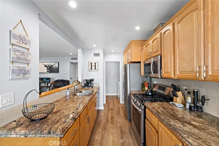 New improved price! Beautiful Upper-Level End Unit in Mission Viejo – this charming 2-bedroom, 1.25-bath condo is located in one of Mission Viejo’s most desirable communities and has LVP flooring throughout. The light-filled living area features recessed lighting and an open layout connecting seamlessly to the upgraded kitchen with granite countertops, shaker cabinets, and modern hardware. The primary suite offers a large window with a view of the mountains, private vanity, and a recently updated walk-in closet, with direct access to the shared full bath. A convenient laundry room near the kitchen fits a full-size washer/dryer with additional cabinet storage. Relax on the spacious patio, perfect for outdoor dining and entertaining. Parking includes a one-car garage with overhead storage and an additional assigned space just steps away. Community amenities include a pool, wading pool, playground, and tot lot, with nearby award-winning schools, shopping, and dining. Residents also enjoy exclusive Lake Mission Viejo membership.