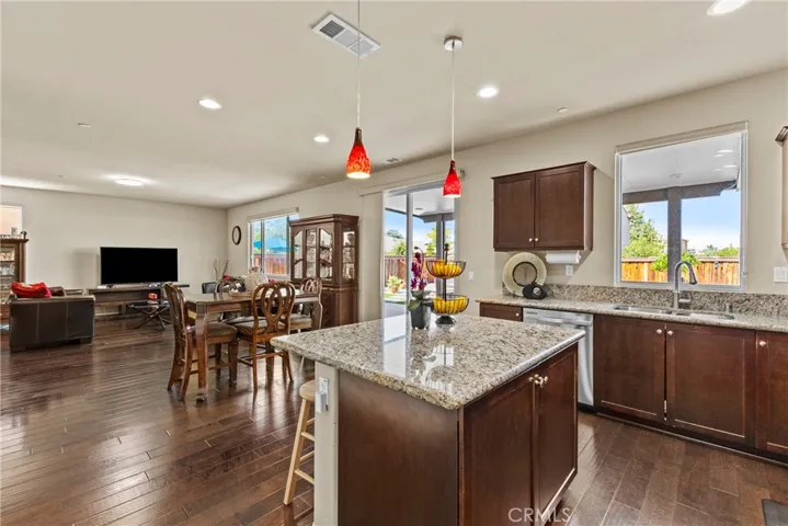 Step inside to find an open-concept floor plan designed for both daily living and entertaining. The gourmet kitchen features granite countertops, a huge center island, stainless steel appliances, and an abundance of cabinetry—perfect for gathering with family and friends. The hardwood floors downstairs add warmth and sophistication, while plush carpeting upstairs ensures comfort in the private living spaces.