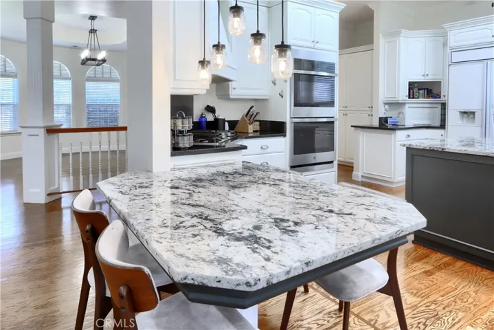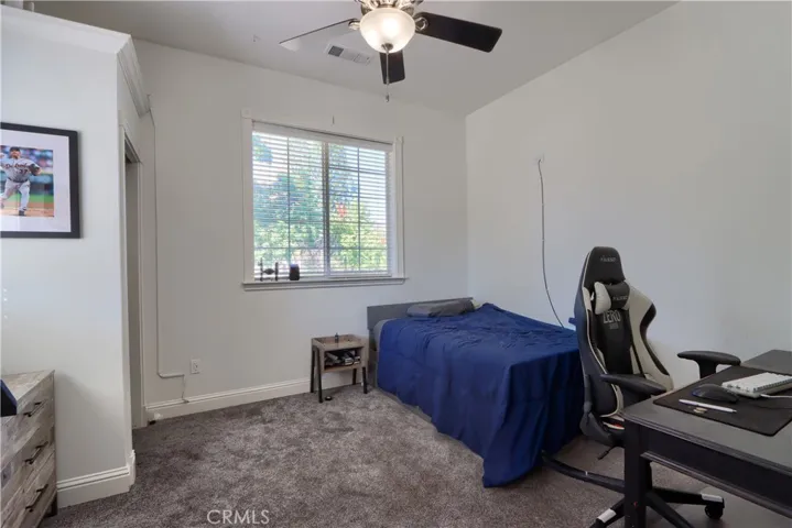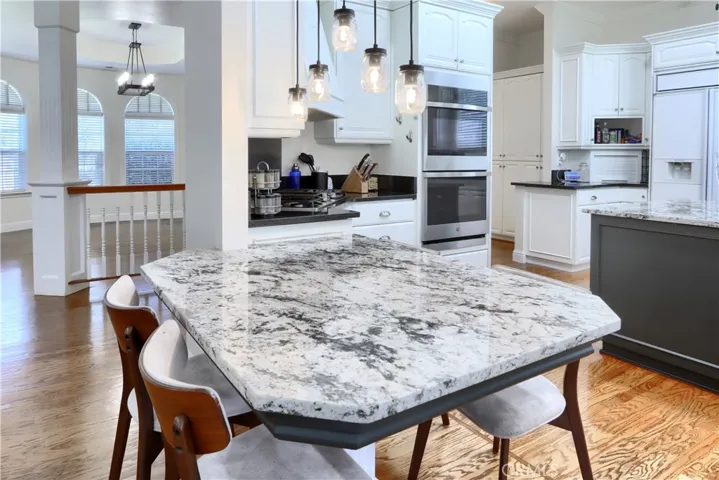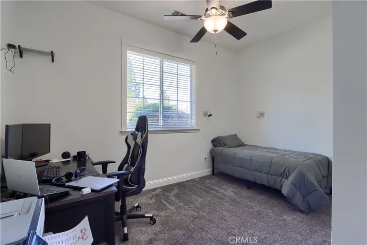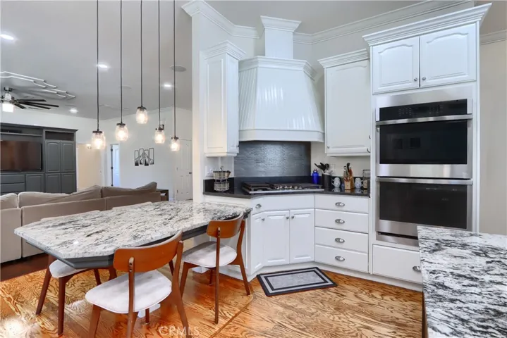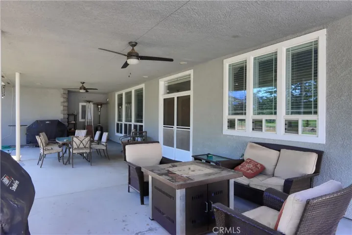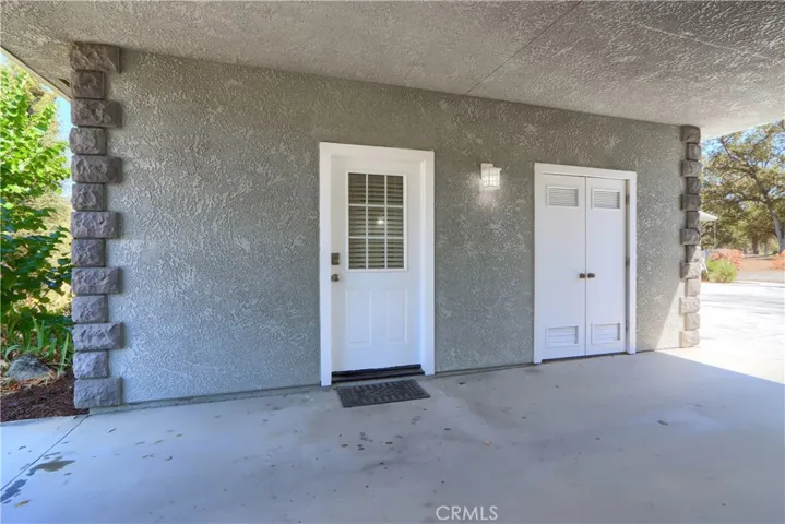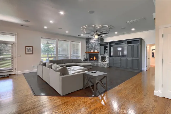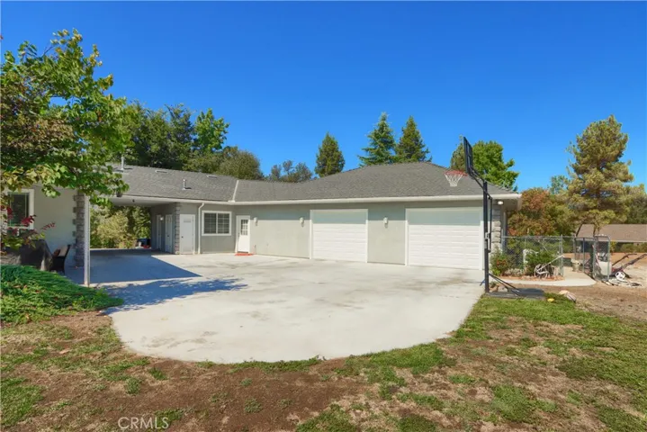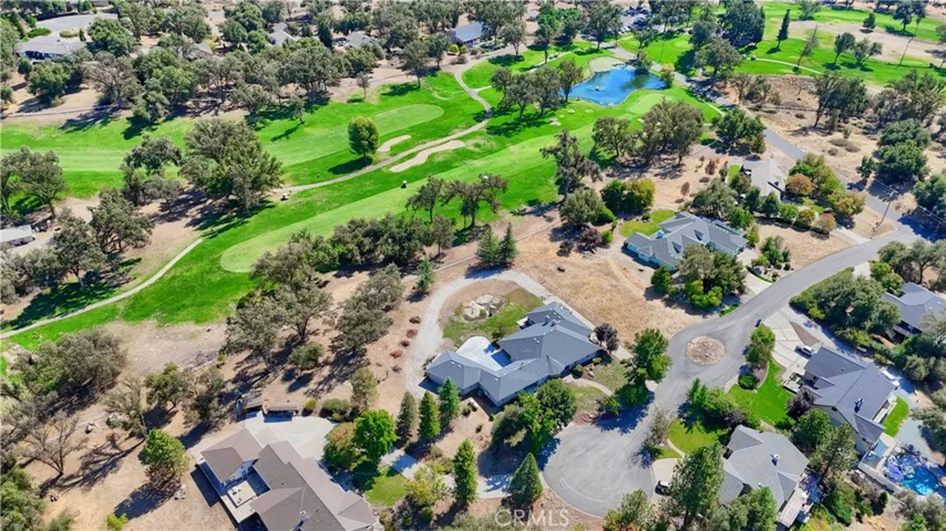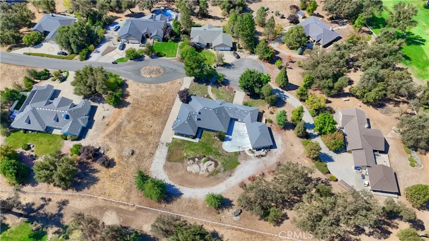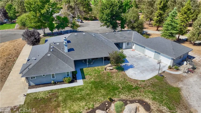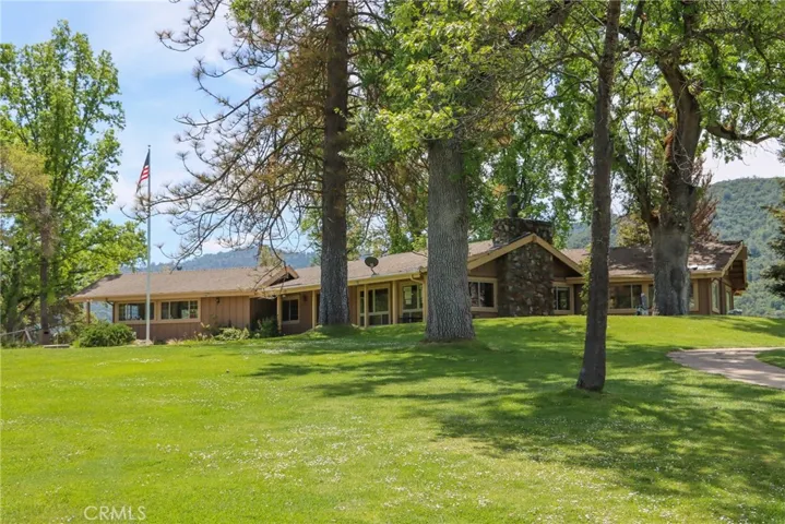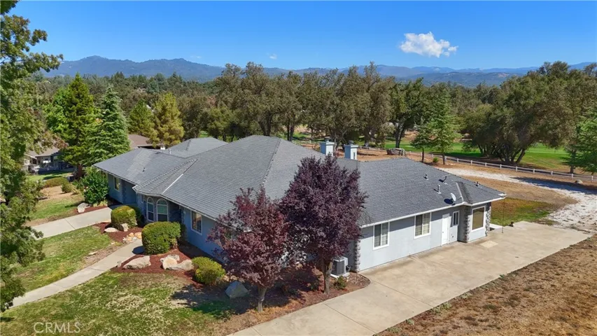 On the 6th fairway in River Creek Golf Course, this custom 5-bed/4-bath, 3,050 sq. ft. home on 1.02 acres includes a separate bonus room with full bath and its own split HVAC, plus a unique drive-through breezeway separating the bonus room, garage from the main residence. A spacious great room, with coffered ceilings, centers around a raised-hearth wood-burning fireplace, while the primary suite features a custom built-in propane fireplace. The upgraded kitchen offers granite countertops, new paint, propane cooktop, double ovens, and a trash compactor, with a casual breakfast nook and a formal dining room nearby complete with a San Miguel Mission-style columns. Throughout are carpet, tile, laminate wood, and stained concrete floors with custom baseboards and crown molding, panel and custom doors. Practical comforts include two standard water heaters (one at each end of the home), two separate HVAC systems, a centrally located laundry room near the bedrooms, RV parking, underground utilities, gutters, sprinklers for the landscaped yard, and a generator hookup. Located in beautiful Ahwahnee River Creek Estates,near downtown Oakhurst with quick access to Bass Lake and Yosemite National Park.
