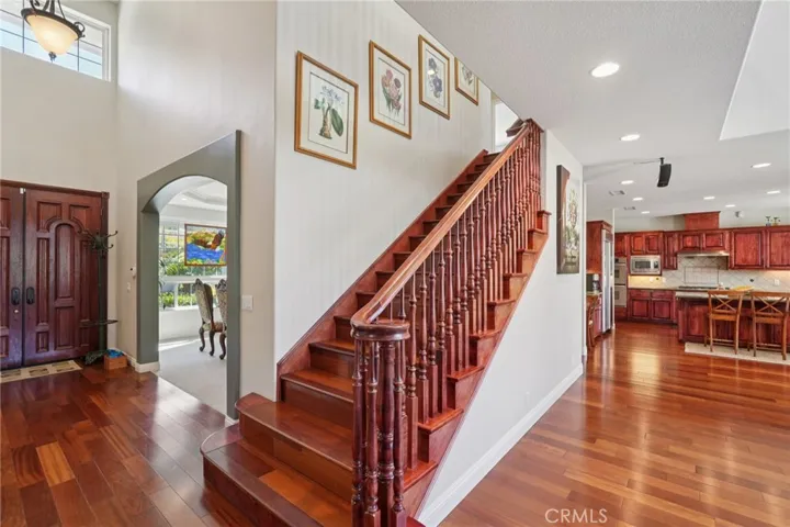 Welcome to your dream home nestled in one of Temecula’s most sought-after neighborhoods. This custom-built residence offers a harmonious blend of elegance, comfort, and scenic beauty. Professionally landscaped grounds frame the property, showcasing breathtaking country views that set the tone for tranquil living. Step into a grand entry foyer that opens to a spacious family room on the right and a formal dining room on the left—perfect for entertaining. Beyond the foyer lies an expansive Family room featuring soaring vaulted ceilings, a custom-built entertainment center with rich cabinetry, and a cozy & fireplace with a hearth that invites relaxation. The gourmet kitchen is a chef’s delight, adorned with custom Cherrywood cabinetry, gleaming granite countertops, and a walk-in pantry for ample storage. Imported hardwood flooring complements the cabinetry throughout the home, while plush carpeting adds warmth to the Livingroom and den areas on the main level. A conveniently located laundry room sits just off the kitchen. The main floor includes a generously sized bedroom and full bathroom—ideal for guests or multigenerational living. Ascend the stunning Cherrywood staircase to discover four additional bedrooms and a spacious loft, all carpeted for comfort with central Vacuum system. The luxurious master suite features an en-suite bathroom with a Jacuzzi tub, walk-in shower, dual granite vanities, and a large walk-in closet. From the second-floor bedrooms and loft, enjoy sweeping views of the serene countryside. Designed for year-round enjoyment, the backyard and side yard are an entertainer’s haven. Gather around the outdoor fireplace or firepit, dine al fresco at the built-in BBQ and counter area, and host unforgettable gatherings under the stars. The property also includes RV parking with space for two large vehicles. Step outside your door and onto miles of scenic walking trails. Meadowview offers residents access to 380 acres of open space, 23 miles of trails for hiking, biking, and horseback riding, plus resort-style amenities including pools, a spa, kiddie pool, tot lot, picnic areas, and courts for basketball, tennis, and pickleball. Equestrian enthusiasts will appreciate the arena and round pens. This exceptional property offers a rare opportunity to enjoy luxurious country living with all the conveniences of a vibrant community. Paradise is not a destination—it’s your new home.