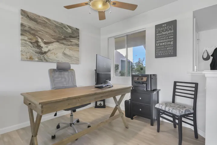 Charming Golf Course Retreat with Mountain Views! Welcome to this stylish and remodeled 1 BR and 1 BA lower level condo offering the perfect blend of comfort, convenience, and resort – style living. Located in a highly desirable community with pool, spa, tennis, pickleball, and golf. This gated community is beautiful and well maintained, this home is ideal as a full-time residence, vacation getaway, or investment. Step inside to find wood flooring, new white Quartz countertops, and stainless steel refrigerator, stove and microwave, newer paint, updated bathroom vanity and barn door. The primary bedroom has ample space and a nice sized closet, the dining area being used as an office has a new ceiling fan. The open layout flows seamlessly to a south-facing patio with golf course and mountain views perfect for relaxing or entertaining. Enjoy the perks of no stairs, lower unit with easy access, detached 1 car garage. The community’s prime location is unmatched – just across the street from the world – renowned PNB Paribas Tennis Tournament, and close to shopping, dining, and desert attractions. Don’t miss this adorable and move in ready home in a sought after setting with endless lifestyle amenities, and the condo is being sold furnished per sellers inventory list.Open house this Saturday 10:00 to 1:00 and Sunday 11:00 to 2:00.