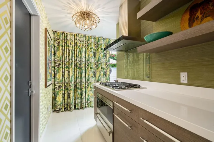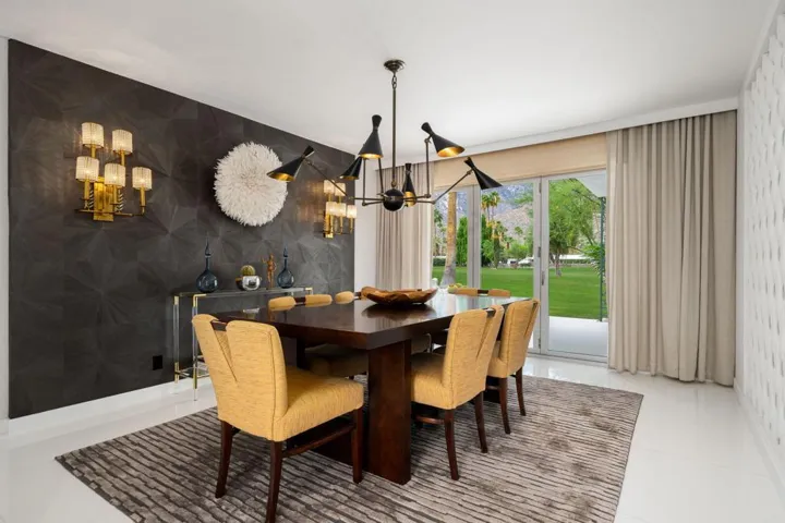 This exceptional midcentury residence is located on the 17th fairway of the Indian Canyons golf course in South Palm Springs, offering 360-degree mountain views. Meticulously remodeled by renowned Palm Springs designer Christopher Kennedy and previously showcased as the Modernism Week Showhouse, this home seamlessly integrates stunning La Cantina folding and pocketing glass doors to frame the spectacular fairway and mountain vistas. The property features multiple elegantly appointed outdoor living areas, including a convenient pass-through window from the kitchen for effortless entertaining. Upgrades include new front gates, a dedicated catering kitchen adjacent to the main social kitchen equipped with Wolf and Sub-Zero appliances, 2 dishwashers, and premium plumbing fixtures from Dornbracht, Brizio, and Duravit. Additional highlights consist of designer wall treatments, custom window coverings, bespoke cabinetry in the fully finished garage, a 35-panel owned solar system, automated blinds, and oversized porcelain slabs throughout the exterior spaces. Situated in one of Palm Springs’ most desirable neighborhoods, this home exemplifies sophisticated, high-end design.
