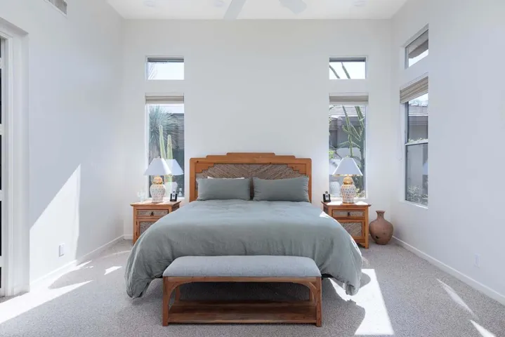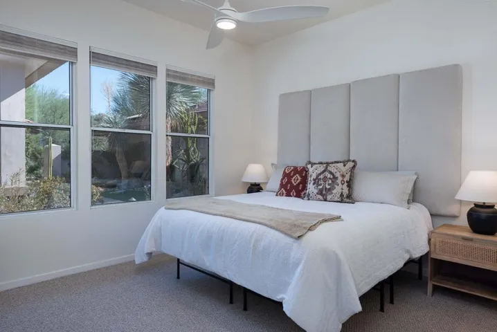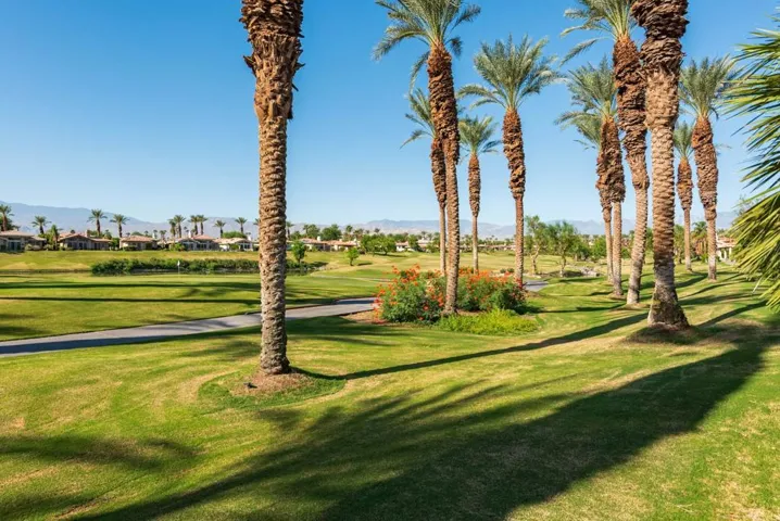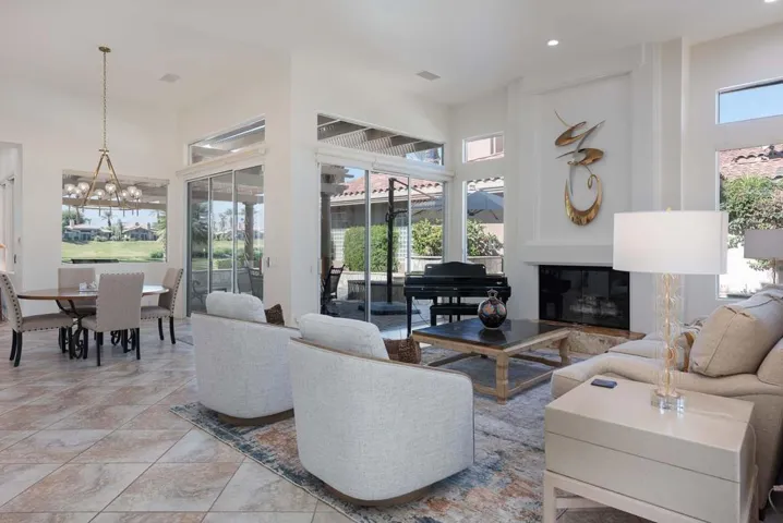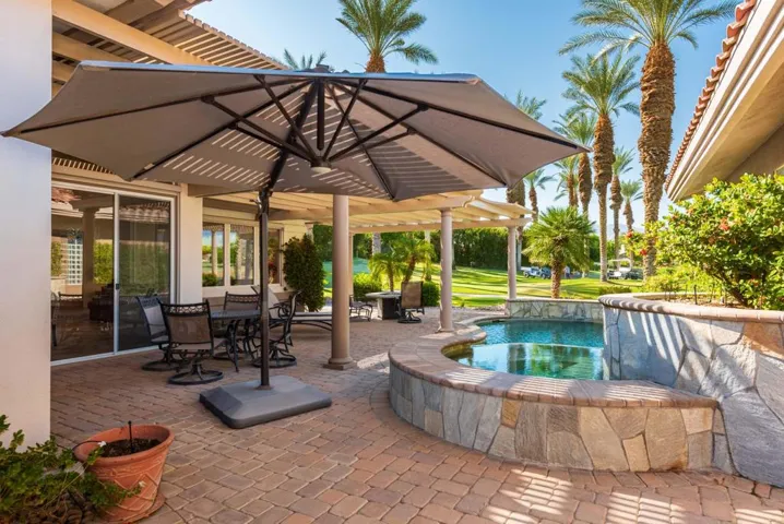 Step into refined desert living with this beautifully redesigned Smoke Tree 2 model, ideally positioned to capture sweeping southern views of the lake, mountains, and Grove Course #6. This bright and airy home boasts an open-concept layout creating an expansive flow between living and dining areas. Tucked away in a peaceful location set back from the fairway, the property offers a private oasis complete with a saltwater pool and spa, cascading water features, built-in BBQ, and an upgraded electric awning with pergola for added shade and comfort. Perfect for entertaining or relaxing under the sun. Interior upgrades include new electric shades, recessed lighting, elegant paver stonework, and a custom golf cart garage. The neutral flooring throughout is complemented by plush carpeting in the bedrooms. Enjoy seamless indoor-outdoor living, with direct patio access from all main living areas. A cozy fireplace and full bar elevate the living room ambiance, while the updated kitchen features a stylish bar-height counter and modern cabinetry. The spacious primary suite offers two generous walk-in closets, and the ensuite bath includes dual vanities, a jetted soaking tub, and a separate walk-in shower. Both guest bedrooms are ensuite as well, providing a comfortable and private retreat for visitors. Additional features include a two-car garage plus a separate, custom-built golf cart garage with epoxy floors. Pavers enhance the curb appeal and continue through the front courtyard and backyard entertaining area. Club Membership is available to the buyer.