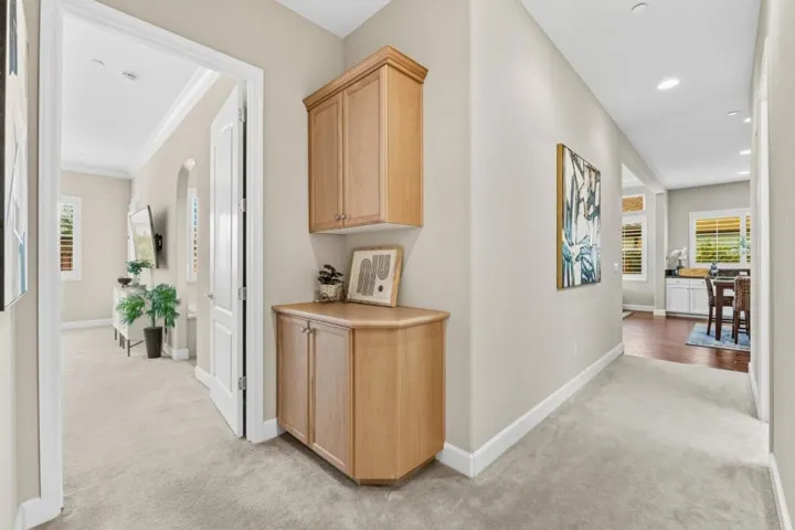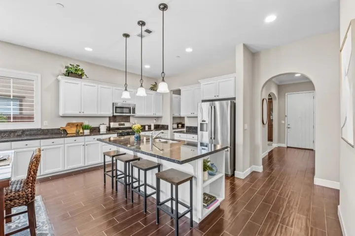 Welcome to a rare opportunity for serene waterfront living in the private, gated community of Oakwood Shores. The community includes a clubhouse, playground, pool, landscaped lakefront areas. This beautifully maintained single-story home offers 3 bedrooms, 2.5 bathrooms, and sweeping lake views. The thoughtfully landscaped backyard and spacious side yard provide endless versatility whether it’s quiet mornings, joyful gatherings, or simply soaking in the natural beauty right outside your door. Step inside to a warm and inviting kitchen, featuring premium Bosch stainless steel appliances, an oversized granite island, and extra-long base custom cabinets that maximize storage and functionality. Generous space for cookware, pantry items, and everyday essentials, the kitchen flows seamlessly into the dining and family areas, creating the perfect setting for both cozy dinners & lively celebrations. Every detail of this home has been carefully considered from elegant tile work and ambient lighting to built-in shelving and plantation shutters throughout. Comfort, style, and functionality come together in a move-in-ready home designed for everyday living and special moments alike. Imagine the possibilities here at Oakwood Shores.