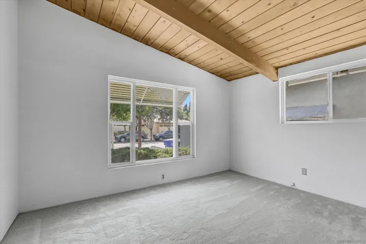 Mid Century Vibes with wood beamed ceilings throughout! All 3 bedrooms have new carpet and the living room has brand new luxury plank vinyl! Both baths have new vanities. Almost all the windows are newer dual pane. The garage is attached. Such a great area close to SDSU and access to freeways.