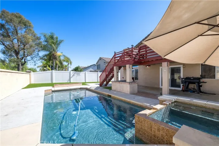 Welcome to this beautifully upgraded four-bedroom, three and half bath home offering 1,946 sq. ft. of living space and exceptional amenities throughout. Nestled in a desirable location with no neighbors behind, this property features a sparkling pool and spa, along with an outdoor kitchen and built-in barbecue, perfect for entertaining. The primary suite includes a private deck with stairs leading directly to the backyard oasis. Two bedrooms are conveniently located on the first floor, while the home also showcases updated bathrooms, fresh interior paint, and turf landscaping in the backyard for easy maintenance. The remodeled kitchen boasts granite countertops and newer stainless-steel appliances. Additional highlights include a three-car garage, potential gated boat/RV parking, solar panels with Tesla charging stations. Beat the power company’s rate with the leased solar. Also included in sale are the mounted TVs, plus washer and dryer.