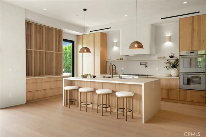 Welcome to 4500 Calhoun Ave, an extraordinary new construction in the heart of Sherman Oaks, built and designed by Thynk Developments. This 2025 architectural masterpiece seamlessly blends organic textures with minimalist design to create a warm yet sophisticated living environment. Clad in travertine stone, the striking exterior sets the tone for the refined elegance found throughout the home. Nearly every wall and ceiling is finished in hand-applied limewash, complementing the home’s soaring 11-foot ceilings and creating a warm, natural aesthetic. Expansive doors and an open-concept floor plan flood the interior with natural light.