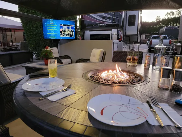 Tucked into a peaceful setting at Outdoor Resort Indio, Lot 158 offers the perfect balance of privacy, comfort, and resort-style living. Mature hedges frame the back and sides of the lot, creating a secluded outdoor retreat, while a small opening at the rear provides direct access to the Phase 2 golf course path and a glimpse of the fairway beyond.The heart of the lot is centered around a large sunshade with a ceiling fan and TV mount, ideal for relaxed afternoons or game-day gatherings. Evenings are enhanced with light posts, a fire table surrounded by six chairs, and the soothing sounds of two water fountains–one at the back corner and another near the front of the lot.A medium-sized outdoor kitchen with sink makes cooking easy, while a BIKE BUNKER storage unit with coded entry provides secure space for bicycles and gear, doubling as an added privacy buffer at the back of the lot. With tasteful landscaping and all the essentials for entertaining, Lot 158 is ready to elevate your Class A motorcoach lifestyle.Outdoor Resort Indio is a Class A only RV resort.