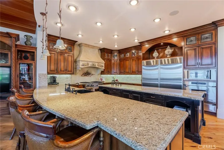 Among the rare custom Westridge Estates perched along the 18th green of The Oaks golf club, a PGA Tour designed golf course, with spectacular views of the entire Santa Clarita Valley! One of the larger lots overlooking the course with an entertainers yard featuring a beautiful pool, spa and plenty of room for play or just watching the amazing view, all with the security of a 24-hour guard gated community. Designed with both function and sophistication in mind, the open floor plan features a grand entrance with breathtakingly high ceilings and a handmade calligraphy staircase. Spacious primary suite on the main level with vaulted ceilings and a retreat with a fireplace. An additional en-suite bedroom down, ideal for guests or multi-generational living. The spacious kitchen has an unusually large island, custom soft close cabinetry, high-end appliances, and a large walk-in pantry with venting and electrical for dining prep. The kitchen opens to the living room providing the perfect space for those looking to host friends, family, & loved ones. Located upstairs are three oversized en-suite bedrooms, each with their own walk-in closets. Enjoy the remarkable view with your morning coffee or evening wine on the covered deck of the third floor. A finished basement serves as the ultimate game or movie room, and an elevator that seamlessly connects all three levels. The interior was thoughtfully selected with high-end finishes throughout including fresh paint, a spacious laundry room, and a dedicated multi-purpose room. Custom ¾ inch thick hickory flooring in the kitchen, dining room, and upstairs hallways too. The massive subterranean 10-car garage that’s approximately 3,300 sq. ft. — a collector’s dream! A true backyard oasis — complete with a sparkling pebble tech pool & spa, waterfall, waterslide, built-in BBQ with seating, expansive grassy areas, and generous side yards for recreation. Very few custom estates can combine resort-style living with peace of mind like Oak Meadow does. Truly a one-of-a-kind offering that redefines luxury in Valencia.