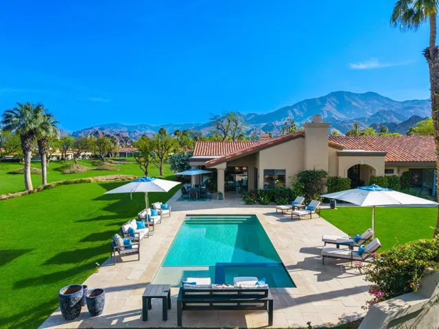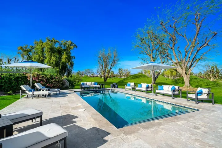 This Point lot is overlooking the triple fairways of #1, 9, & 18 of the Nicklaus Private Course. With far reaching views, the Point lot boasts Western sunsets, Eastern morning sun, Southern mountains, & the Northern desert! The oversized lot has amazing entertainment space with a beautiful saltwater pool & spa, expansive travertine patios offering unencumbered panoramic views. The interior of this home, detailed by the pictures is simply stunning! Tall vaulted ceilings, beautiful modern flooring with an architecturally designed fireplace enhancing the beauty of this home. Spacious kitchen with abundant storage & pull out pantry to enhance any chef’s dreams. Large island with waterfall feature stands as an entertaining space or work area. This Legends 40 has been completely renovated to bring a contemporary open floor plan & maximize views of the outdoor living spaces. There are 2 separate living areas off the kitchen, 3 large bedrooms, all with en-suites, making this property ideal for weekend getaways or a full time residence. Throughout you will find natural stone in the primary, & secondary baths, with waterfall counter tops & Rohl polished nickel fixtures. The bathrooms also feature walls beautifully accented with wallpaper. Our desert is meant for enjoying early morning sun & warm summer nights. The outdoor entertaining space indulges those desires. Envision yourself through the outdoor pictures, relaxing, entertaining, & enjoying your new home!