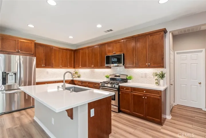 Welcome to 25006 Pine Creek Loop, a beautifully upgraded corner lot home nestled in the desirable community of Sycamore Creek located in Temescal Valley. This luxurious 4 bedroom, 3.5 bath home features luxury vinyl plank flooring throughout the first floor, combining style with durability. The stunning kitchen boasts sleek quartz countertops, beautiful marble backsplash, stainless steel appliances and a huge island, perfect for culinary enthusiasts. The inviting layout includes a family room as you enter the home that has multi-functional uses such as an office or game room. Beyond the family room is a formal dining room that leads to the living room. The combined living room and kitchen is great for entertaining and features a new built-in for your T. V. , ceiling fan and added lighting. Relax on your couch and enjoy the gas fireplace on cooler nights. As you head upstairs, you’ll notice the newer plush carpet and additional storage a with two desk areas. The primary suite is a true sanctuary, featuring a ceiling fan and large en-suite bathroom. The luxurious primary bath features a walk-in closet, dual sinks, and a dedicated vanity area. Indulge in a spa like experience with a jacuzzi tub and walk-in shower, providing the perfect escape after a long day. Three additional bedrooms, with one bedroom offering its own private bathroom, is perfect for guests or family members seeking extra privacy. An additional full bathroom, with dual sinks, is located adjacent to the spacious laundry room rounding out the upstairs. Additional features include a three-car tandem garage and new A/C and heating units. The backyard is a lush, inviting retreat framed by mature landscaping. A vibrant lawn stretches across the yard, perfect for relaxing, playing, or entertaining. The covered alumawood patio with fan offers plenty of room for outdoor seating or a dining table. Enjoy the built in BBQ island and an assortment of fruit trees including: grapefruit, lemon, orange, lime, fig and apples. Conveniently located near the award winning Todd Elementary this property is not just a house, it’s a place to call home. The Sycamore Creek community features two community pools, baby pool, splash pad, clubhouse, gym, parks, hiking trails and much more. DeLeo park is also located in Sycamore Creek and features playgrounds, splash pad, sports fields, dog park, skate park, bike park, and pickleball. Don’t miss the opportunity to make this stunning property your own!!!