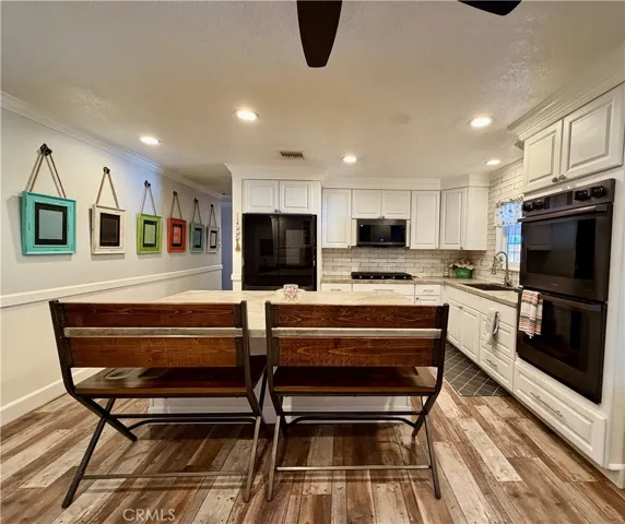 The elevated kitchen offers a built-in double oven, five-burner stovetop, microwave, and a charming built-in hutch/coffee bar with a butcher block countertop. A kitchen window overlooks the covered backyard porch, and a spacious island with seating for four makes casual meals easy and convenient.