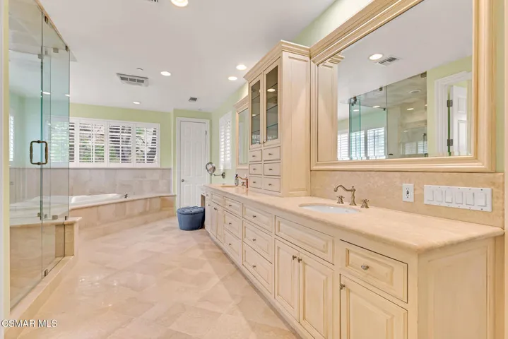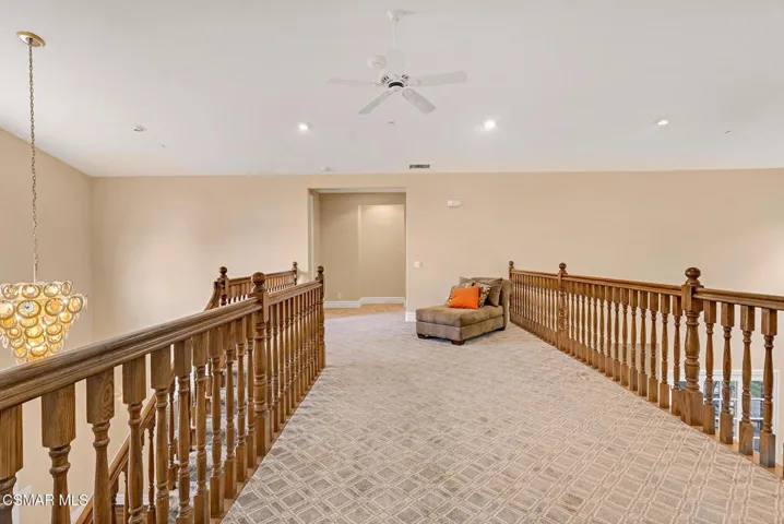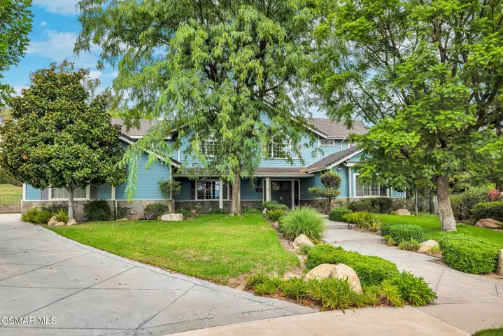 A rare offering in Simi Valley, this custom 6-bedroom, 6.5-bath estate crowns the end of a quiet cul-de-sac, presenting over 5,600 sq. ft. of refined living on a 25,000+ sq. ft. lot. Currently owned by a Hollywood producer who sought a private retreat outside the city, the estate has also hosted gatherings attended by movie stars, directors, and producers — a testament to its scale and entertaining appeal. The approach is framed by mature shade trees, lush landscaping, river rock accents, and a custom river rock mailbox. An extra-long and wide stamped concrete driveway with possible RV parking enhances curb appeal, while the custom double-door entry with leaded glass sidelights sets a welcoming tone. Inside, the foyer opens with real wood floors, soaring ceilings, and an artisan agate chandelier. To the left, a study/office with floor-to-ceiling custom built-ins provides the perfect setting for a home library or workspace, while still offering the versatility of a bedroom with ensuite bath. Nearby, French glass doors open to an additional room, previously used as a music room, ideal as a den, playroom, or creative space. The formal living room rises to 30 feet with abundant windows and a travertine raised-hearth fireplace, while French doors lead to the backyard. Off the living room, a dedicated theater room boasts a 210′ screen, Sony projector, blackout curtains, surround sound, and 7 reclining chairs — all included. The gourmet kitchen showcases two full-capacity Sub-Zero units–refrigerator and freezer, a Viking 6-burner cooktop with griddle and hood flanked by custom spice racks, a Viking microwave, Bosch dishwasher, abundant cabinetry with built-in storage nooks, and an extra-long granite island with travertine accents and pendant lighting. A butler’s pantry with sink, wine refrigeration, and walk-in pantry enhances functionality, while a built-in china cabinet and casual dining area add charm. A second bedroom with adjacent bath, laundry room, and guest powder room complete the lower level. Upstairs, an open loft-style landing creates a striking catwalk across the home, overlooking the living areas below and connecting the bedrooms. The primary suite offers a private retreat with a balcony overlooking the backyard, sitting area, fireplace, dual walk-in closets with organizers, and a marble bath with dual vanities, soaking tub, and steam shower with dual heads. Three additional ensuite bedrooms with closet organizers complete the upper floor. The backyard feels like a private park, with expansive lawns, stamped concrete patios, covered sitting areas, koi pond with waterfall and wood bridge, rose gardens, grapevines, and fruit trees — plus plenty of space to add a pool, greenhouse, or other features to fit your lifestyle. The spacious 3-car garage includes epoxy flooring, overhead storage, an updated electrical panel, two 220v outlets for EV charging, and a full-size safe. Energy efficiency is enhanced by a solar system paired with four Tesla wall batteries, designed to provide significant backup capability, including support for the home’s zoned A/C system. Additional features include three fireplaces, dual-paned windows with shutters, Nest temperature controls in every room, a recirculating water heater, a replaced sewer line, and fiber-optic connectivity for reliable high-speed internet access. Additional highlights include no HOA, a quiet neighborhood setting, and proximity to Lemon Park. Finishing touches include all artisan chandeliers and sconces handcrafted by Corbett. Blending custom design, thoughtful upgrades, and resort-style grounds, this estate is truly one of Simi Valley’s premier residences.
