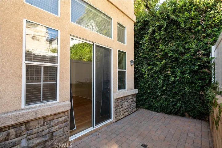 Step inside to a living room with high ceilings, wood floors, plantation shutters, and sliding doors that open to the private patio—perfect for indoor-outdoor living. Just off the living room is a convenient half bath. A few steps up, the dining room and kitchen overlook the living area, creating an open, airy flow. The updated kitchen features granite counters, stainless steel appliances with microwave hood, and crisp white cabinetry.
