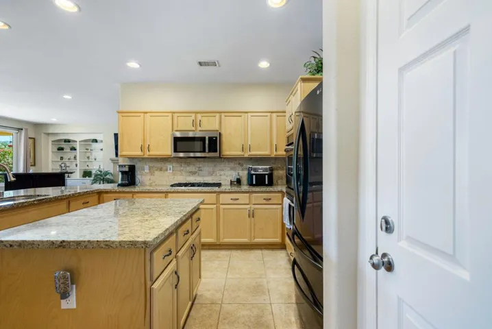 RENTED 2-1-2026 thru 4-30-2026. Welcome to your dream retreat just off the 18th Tee at Trilogy La Quinta! This stunning west-facing oasis, complete with a charming Casita, offers a resort-style backyard that’s perfect for entertaining or relaxing. Picture yourself unwinding in the pebble-finished spa, enjoying the tranquil sound of the rock waterfall, or grilling up a feast at the fully equipped BBQ island. With panoramic views of the mountains, lake, and golf course, your evenings on the shaded patio will be nothing short of magical. Step inside this 1,806-square-foot single-level gem to find three spacious bedrooms, three luxurious baths, and a great room designed for comfort with a cozy tile-encased fireplace and custom built-ins. Recently updated flooring throughout the home. The primary suite is your personal sanctuary, featuring plantation shutters, private patio access, a walk-in closet, and a spa-like en suite bath. The gourmet island kitchen, open to the dining room, boasts granite countertops, a custom backsplash, stainless steel appliances, double ovens, and ample cabinetry–everything a chef could desire. The attached Casita, with elegant wood flooring, provides the perfect haven for guests, ensuring comfort and privacy. An extended 2-car garage, all new Milgard windows, upgraded carpets, ceiling fans, and automatic sunshades complete the package, making this home a perfect blend of luxury and functionality.