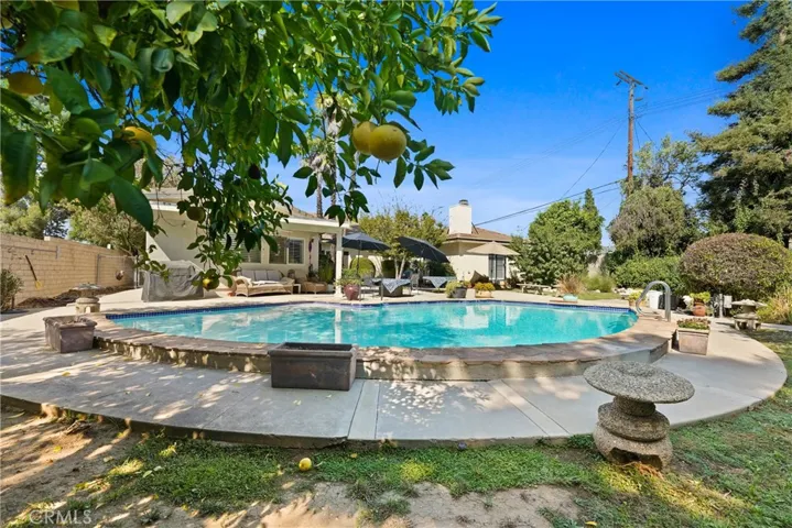 Step outside to your private backyard retreat, complete with a sparkling pool, a pad ready for a sports court or pickleball, fruit trees, and a lush grassy lawn—perfect for entertaining family and friends.