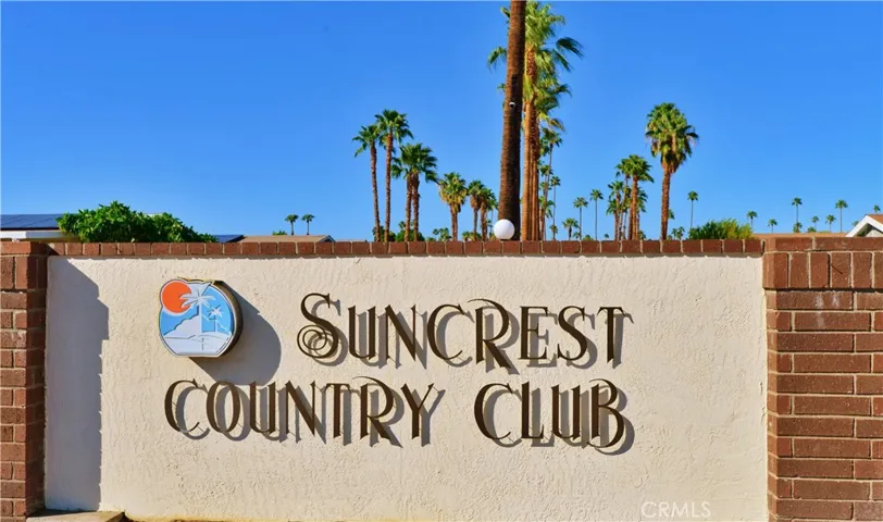 Experience Southern California living in this gated 55+ community of Suncrest Country Club. Palm Desert has a storied history and one that invites people from all over the world looking for warm winters, entertainment and endless social opportunities. This property is centrally located to prime shopping, restaurants and all Palm Desert has to offer. Community itself is well maintained with gate access, a pro shop, 9 hole golf course, pools, spas, cafe, pickleball courts, tennis courts, club house with billiard room, scheduled activities, and a sense of community that brings people together. A stone wall, wrought iron gate and planters welcome you into a courtyard rarely seen within the complex. A deep covered carport is a nice amenity to shade your vehicle and store all your treasures. An expansive living room with a vaulted ceiling and several windows creates a warm and inviting space. Large corner entertaining bar adds an additional gathering and seating. Split floor plan allows for privacy between each of the two large bedrooms. Dining area with built in hutch just off the kitchen provides extra storage and display of your favorite dishes. Master bedroom and bath is impressive with an extra large closet and corner soaking tub in bath. Property and community is ideal for seasonal stays or full time country club living.