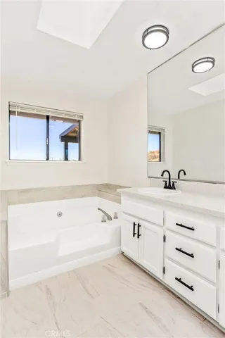 Primary suite includes a large walk-in closet, ceiling fan, and remodeled bath with dual granite vanities, tiled walk-in shower, soaking tub, and skylight. Two additional bedrooms feature ceiling fans and share a full bath with granite vanity and shower/tub combo.