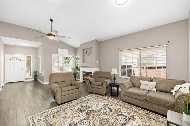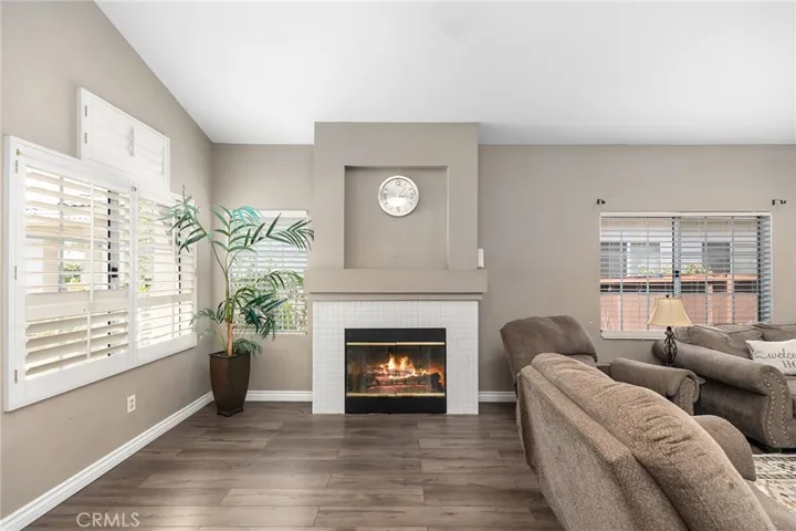 As you step inside, you’ll be greeted by vaulted ceilings and an open-concept layout that creates an airy, light-filled atmosphere. The living area features a cozy fireplace and tasteful wood-laminate flooring throughout—no carpet in sight. Plantation shutters and generous windows enhance the home’s brightness and warmth.