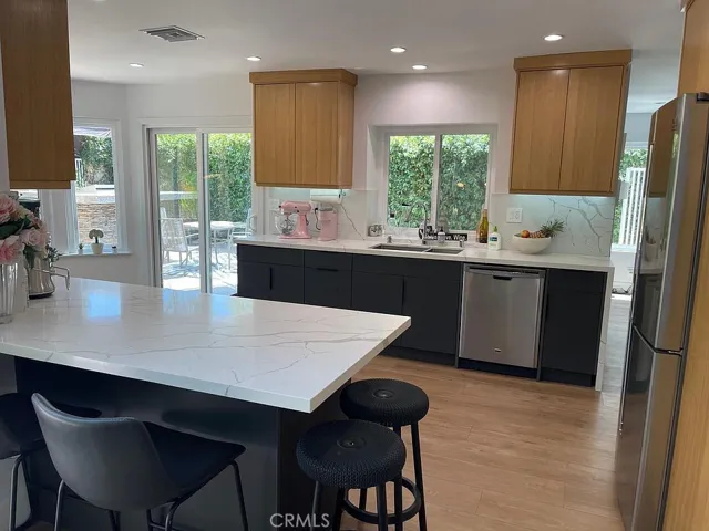 Welcome to this fully remodeled 5 bedroom, 3 bathroom home in the prestigious gated community of Calabasas Hills. Nearly 2,600 sq ft of living space includes a main-level guest room and full bath, elegant wine display, multiple spacious living areas with a fireplace, and a chef’s kitchen with stainless steel appliances, granite counters, and a large center island. Upstairs offers four bedrooms including a luxurious primary suite with a custom walk-in closet, plus custom closets in every room. The backyard is ideal for entertaining with a covered stone patio, built-in barbecue, and lounge areas, while the community provides two 24-hour guarded entrances, pools, spas, playgrounds, and direct access to award-winning Bay Laurel Elementary. Just minutes from The Commons, shopping, dining, and parks, this home perfectly blends modern upgrades with the best of Calabasas living.