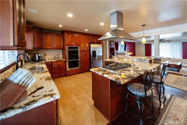 Step inside to discover elegant crown molding and beautiful laminate flooring throughout, complemented by modern recessed lighting and surround sound system. The spacious living room centers around a cozy fireplace, creating the perfect gathering space for family and friends. The chef-inspired kitchen is a true showstopper, featuring stunning granite countertops, designer backsplash, stainless steel appliances, convenient double ovens, and abundant cabinet storage. Both bathrooms have been upgraded with granite countertops and luxurious shower installations.
