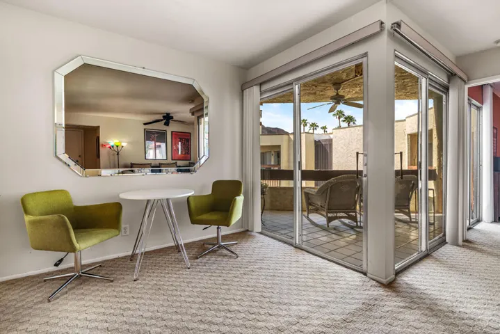 Biltmore II | A Top-Floor Retreat with Mountain Views. This top-floor, turn-key furnished condominium offers the rare serenity of having no neighbors above, with sweeping views of snow-capped mountains as your daily backdrop. From the private balcony, mornings begin with quiet coffee and evenings close with a glass raised to the desert sky.Inside, elegant granite countertops and upgraded flooring complement a bright, open layout that welcomes natural light through a triple set of sliding glass doors. The galley kitchen is finished with sleek tiled granite counters, while plush carpeting underfoot in the living and bedroom areas adds comfort and warmth. A recently installed A/C system ensures year-round ease, making this residence ideal as a winter retreat, seasonal rental, or full-time home.Just moments from Palm Springs’ acclaimed dining and boutique shopping, the community provides secure building access, elevator service, and a dedicated carport. At Biltmore II, pets are welcome, and opportunities to own a tranquil two-bedroom with views of this caliber are seldom available.This is desert living at its most refined–where comfort, style, and location converge in perfect balance.