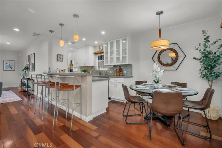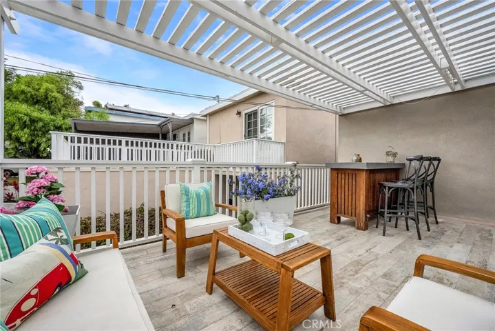 The open floorplan includes a bright living and dining area with fireplace and sliding doors to a beautiful private patio—great for BBQs and warm summer nights. The updated kitchen has newer appliances plus a sweet breakfast counter. Upstairs, enjoy three bedrooms and a sunny nook (or office space) leading to a front deck with a white pergola, balcony, and wet bar—an entertainer’s dream.