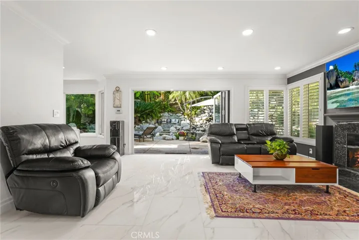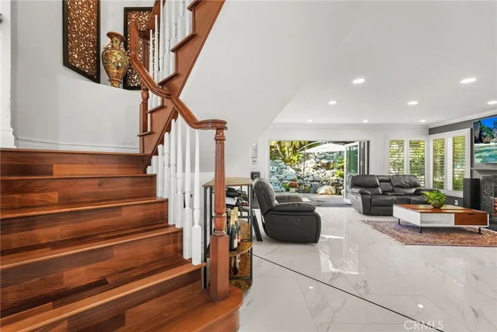 Bi-fold patio doors open to a resort-style backyard with a sparkling pool, relaxing jacuzzi, koi pond, and lush custom landscaping. The outdoor misting/fog system keeps the space cool and refreshing while adding a touch of ambiance to warm summer evenings.