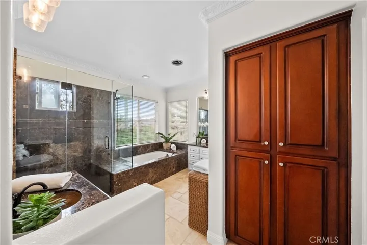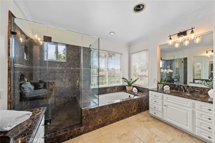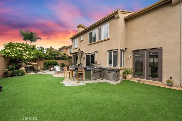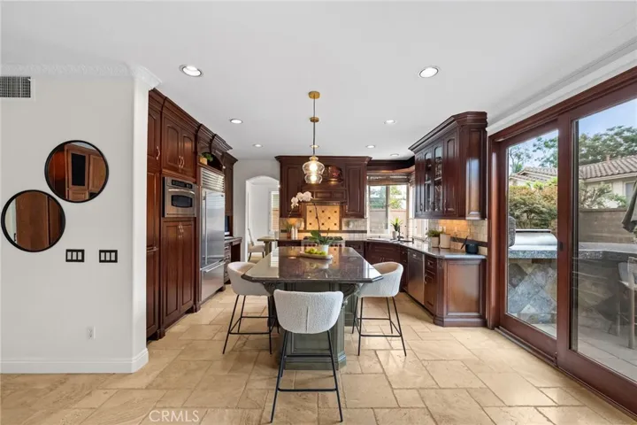 The formal living and dining rooms create an elegant space for entertaining, with large windows and French doors filling the home with natural light. At the heart of the home is a remodeled kitchen featuring rich cherry cabinetry, granite countertops, high-end stainless steel appliances, and a charming garden window overlooking the lush backyard. The adjacent family room, offers a brick fireplace and impressive built ins, and flows directly outdoors—an ideal setup for Southern California’s indoor-outdoor lifestyle.