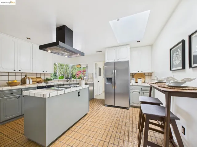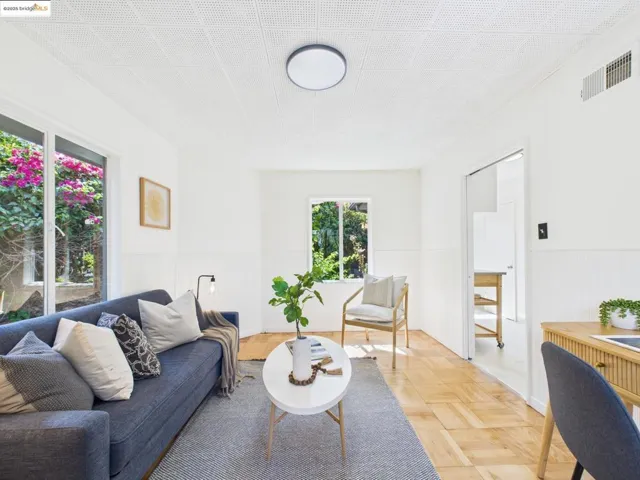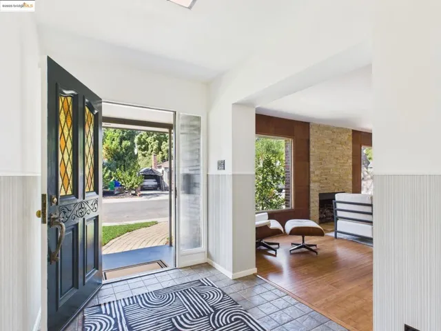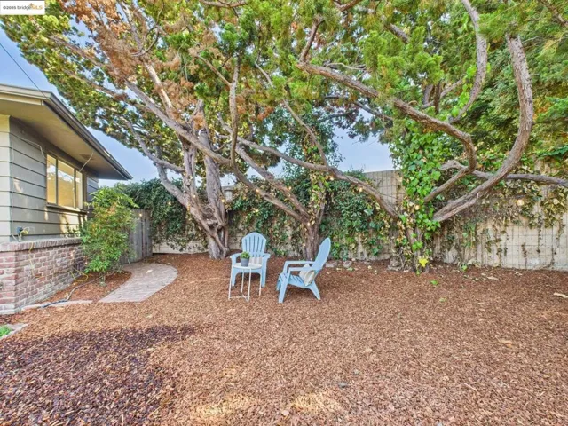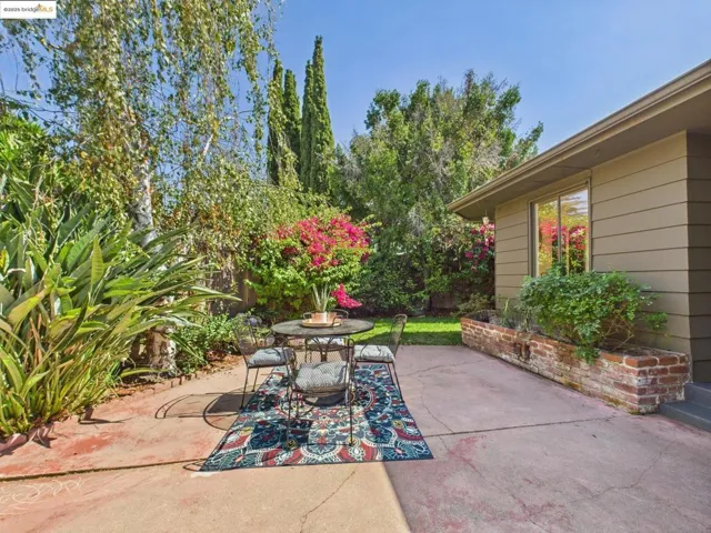 This 4-bedroom, 2.5-bath mid-century modern ranch offers 1,837 sq ft of stylish single-level living on a 5,500 sq ft lot. The living room showcases rich built-in shelving, wood paneling, and a stone fireplace, with expansive windows overlooking the backyard. Walls of glass in the dining area frame lush gardens, while the kitchen pairs tiled counters, a skylight, and island seating with a unique tile floor. The primary suite features parquet floors, a walk-in and second closet, and tastefully updated bathroom. Built-in dressers in the back bedroom and hall highlight the home’s thoughtful storage. Outdoors, a private courtyard with brick planters is perfect for entertaining, a bougainvillea-draped patio makes an intimate retreat, and the side yard’s towering shade trees and open mulched space invite relaxation or play. An oversized one-car garage adds versatility for storage, hobbies, or a workshop. Set on a peaceful cul-de-sac near San Leandro’s shops, parks, and BART, this timeless home blends classic mid-century character with everyday comfort.