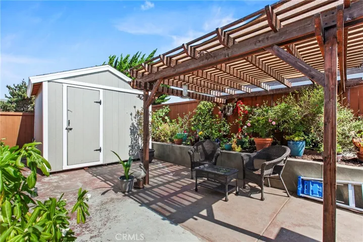 Outdoor living is just as inviting! The elevated entry patio with a drip system is ideal for gatherings with neighbors and friends. The backyard is fully fenced and private, featuring garden planters, a pergola, a large shed, and a patio—perfect for gardening, relaxing, or entertaining.