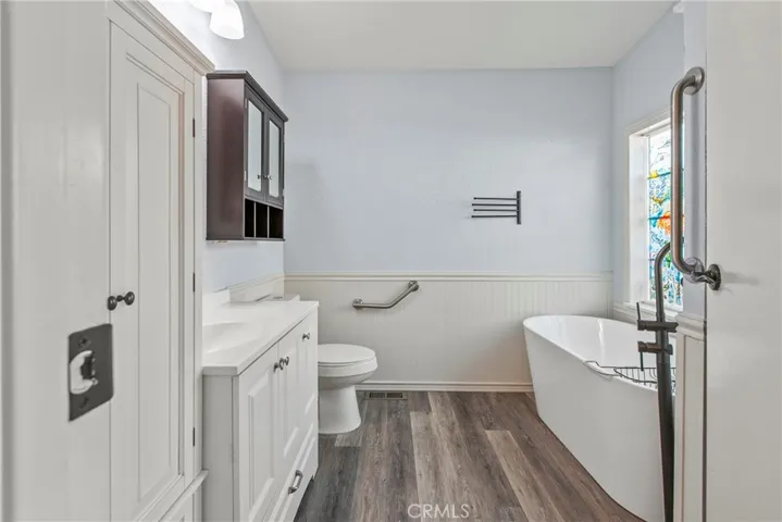 The primary suite is a private retreat with a spacious walk-in closet and direct access to the sunroom. Its spa-like bath includes a large freestanding soaking tub, new corner shower, stylish vanity, and elegant chair rail accents.