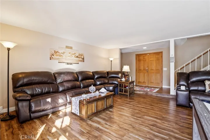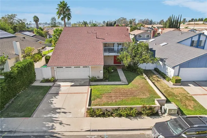 Welcome to this stunning 4-bedroom home PLUS an enclosed downstairs OFFICE and 2.5 bathrooms, offering over 2,100 sq.ft. of comfortable living space. Perfect for entertaining or relaxing, the backyard features a sparkling blue pool, spacious patio and deck area, plus an array of mature fruit trees, including peach, two orange, tangerine, and lemon, providing year-round enjoyment. Step inside through the elegant double-door entry and you’ll be greeted with custom decorator touches throughout: scraped ceilings, crown molding, and warm laminate wood flooring. The remodeled kitchen boasts granite countertops, rich wood cabinetry, and an open eating area with a separate formal dining space for gatherings. A cozy fireplace highlights the oversized living room, ideal for family movie nights and your big-screen TV. Upstairs, a double staircase leads you to the expansive primary suite with a private balcony, perfect for morning coffee or mountain views. Secondary bedrooms are generously sized with plenty of natural light. Recent upgrades include a new roof (2020), newer HVAC system, dual-paned vinyl windows upstairs, a flow meter, and a well-maintained pool with a new pump. Additional highlights include a large two-car garage. Enjoy low tax rates, no HOA, and no Mello Roos. The home is conveniently located near two parks, tennis courts, top-rated schools, and easy freeway access, making it one of the best values in South Orange County!