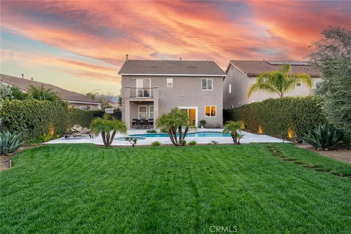 The home extends outdoors to a resort-style backyard oasis featuring a remodeled pool and spa, expansive lush green lawn, and ample space for outdoor entertaining. Thoughtful landscaping includes a creeping fig tree to cover block walls, four beautiful olive trees, and landscape lighting throughout the yard, enhancing the ambiance of this peaceful retreat.