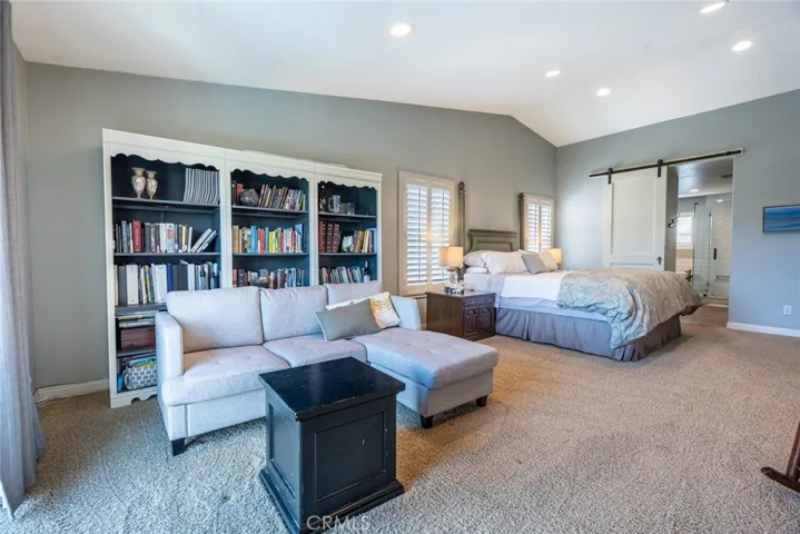 Upstairs, the spacious primary suite serves as a private retreat, featuring a seating area for relaxation and a private balcony with breathtaking mountain views. A vintage barn door leads to the remodeled en-suite bathroom, which boasts a freestanding soaking tub, a walk-in shower with a beautiful subway tile accent, and updated black hardware, creating a serene and stylish space to unwind.
