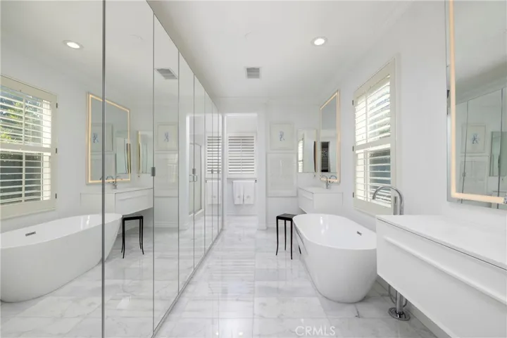 The primary suite is a true sanctuary with a Carrara marble spa bath, soaking tub, dual floating vanities, oversized LED mirrors, and custom lit mirrored wardrobes. Designer touches include French chevron wood floors, Kelly Wearstler lighting and finishes, Buster + Punch hardware, Phillip Jeffries wall coverings, and handcrafted trim, wainscoting, and paneling. Tons of windows fill the home with natural light.